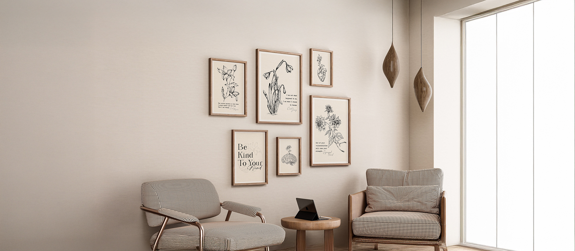 Curated sets of mental-health & motivational art. Build an uplifting, cohesive wall in minutes, affirmations, coping skills, growth mindset. Bundle & save.