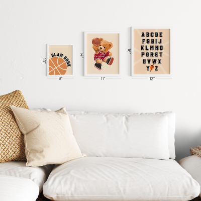 - Born to Play, Built to Dream: Bright, playful, and full of spirit, this baby boy wall art set captures the boundless energy of boyhood through hand-drawn illustrations of basketballs, alphabet letters, and an adorable teddy bear in action. It’s more than decor—it’s a celebration of growth, curiosity, and imagination. This sports nursery decor inspires little ones to dream big from their very first steps.