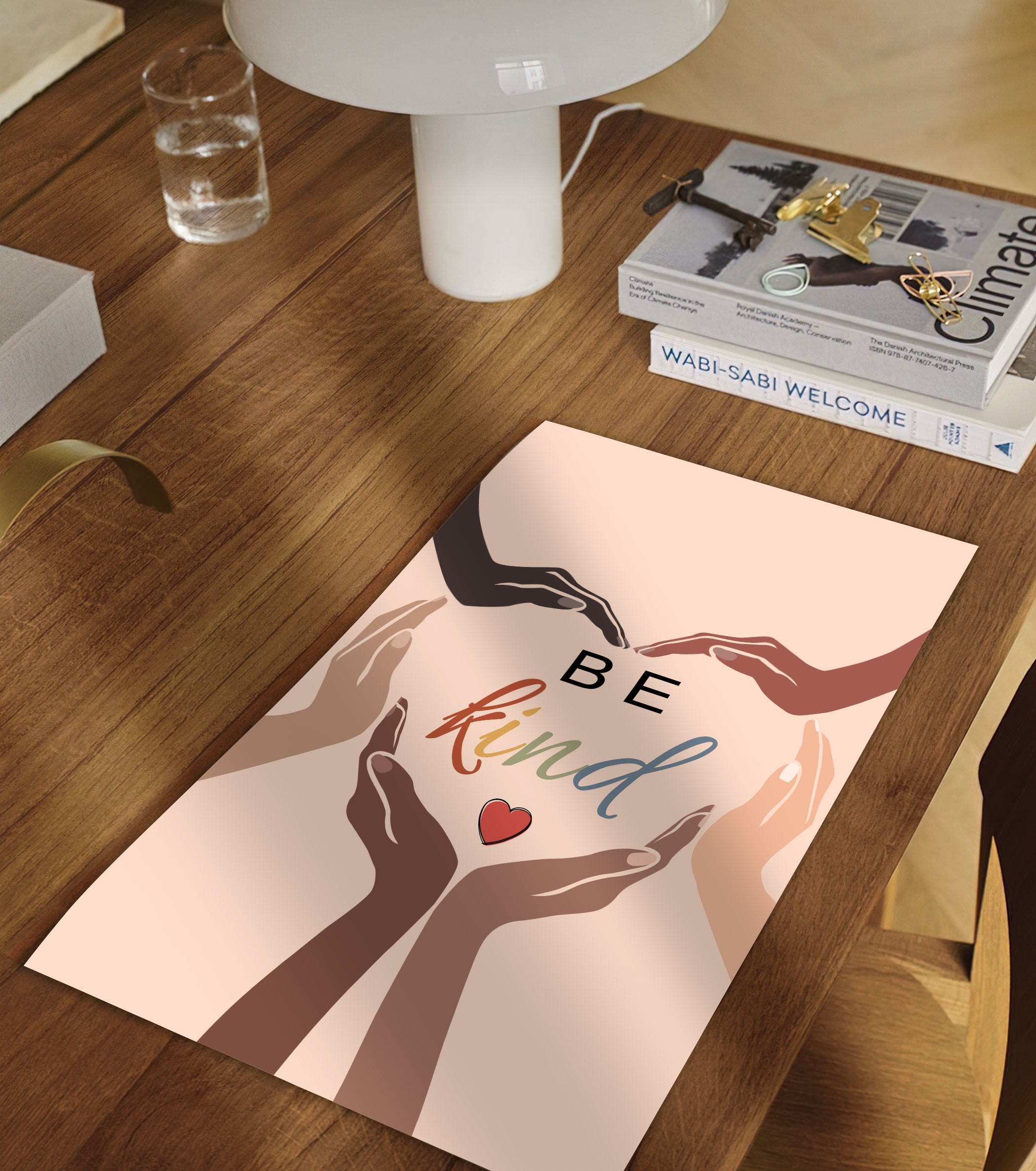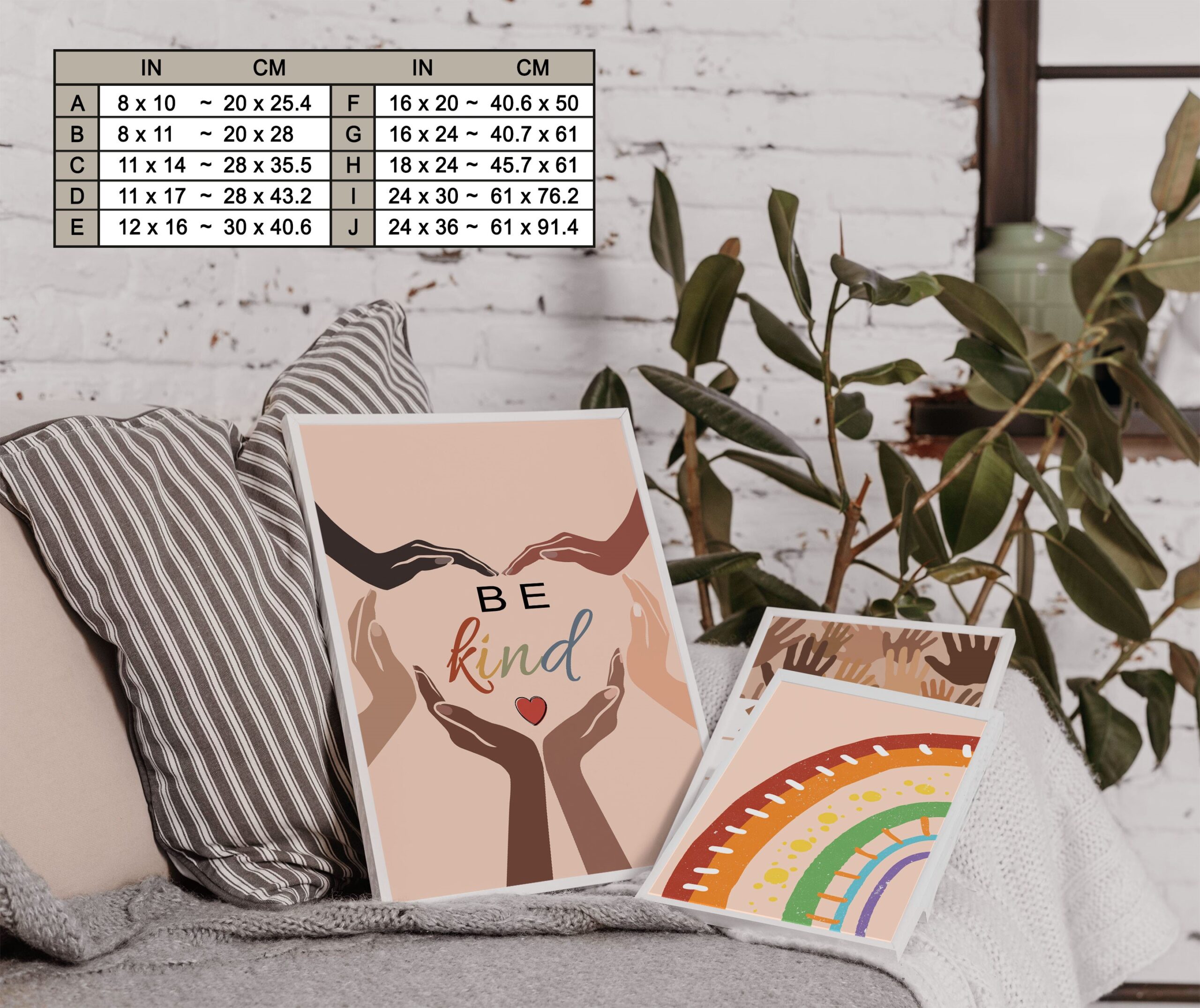 Spread love and unity with this beautifully designed diversity poster. Featuring hands of various skin tones forming a heart around the words Be Kind, this artwork is a powerful reminder of acceptance, equity, and inclusion. The gentle, boho-inspired color palette makes it a perfect addition to any space promoting compassion and respect.