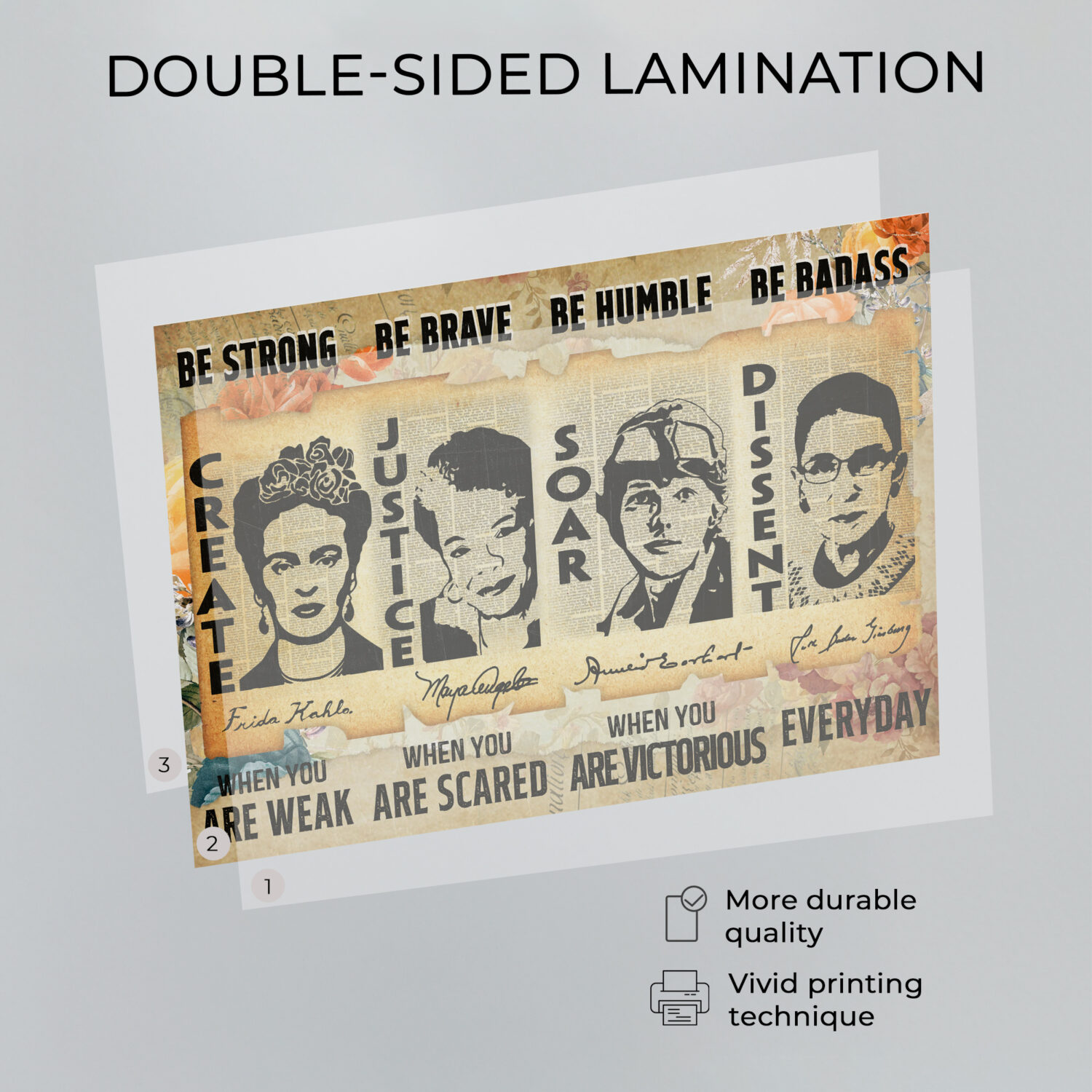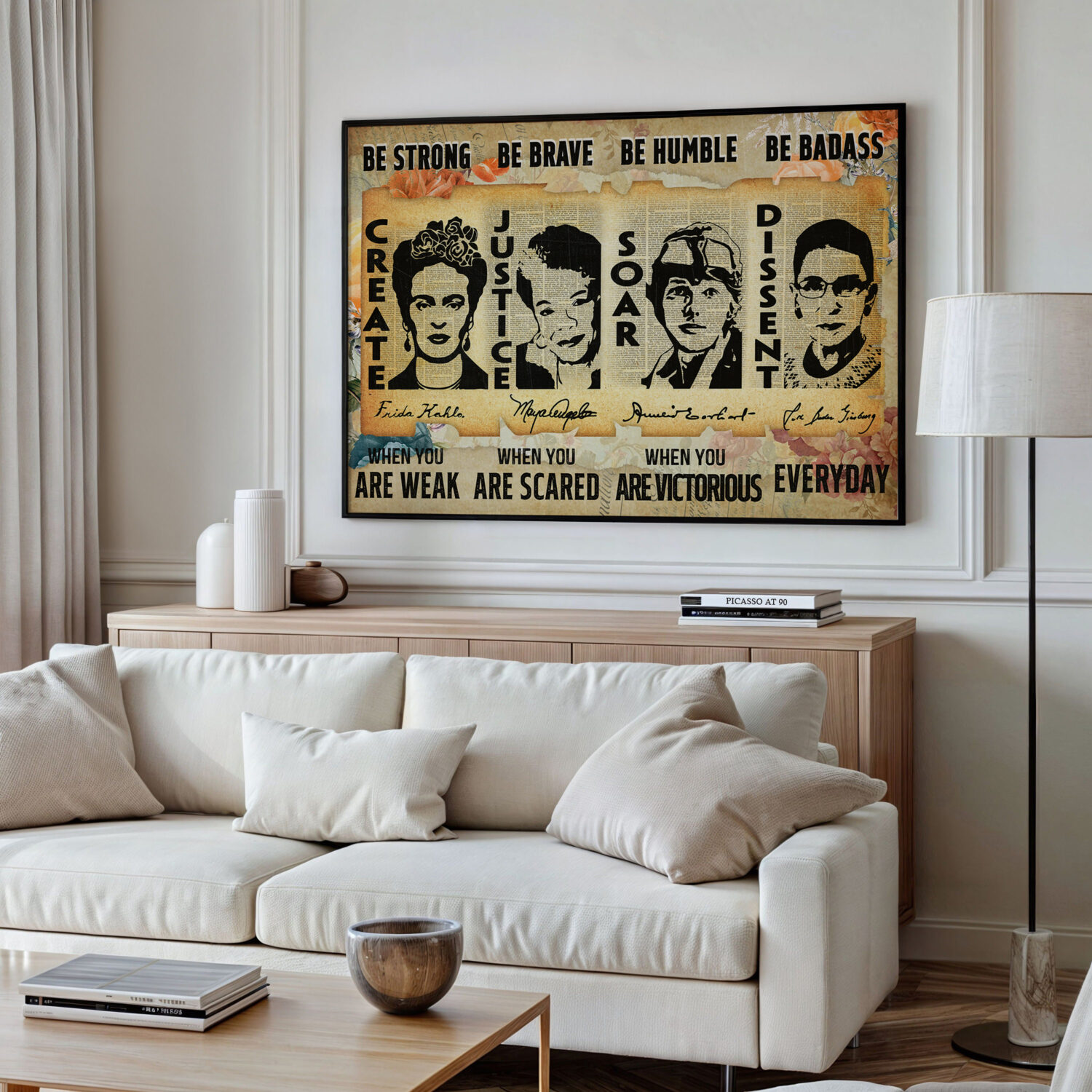 This bold and beautifully vintage empower women poster features striking silhouettes of historic women leaders famous women leaders. With phrases like ?Create,? ?Justice,? ?Soar,? and ?Dissent,? it’s a powerful daily reminder of courage, humility, and strength.