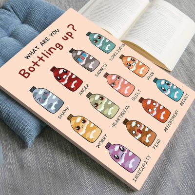 Bottling Up Feelings boho mental health art print can serve as a fantastic visual. Ideal for therapists, counselors, psychologists, teachers, and parents.