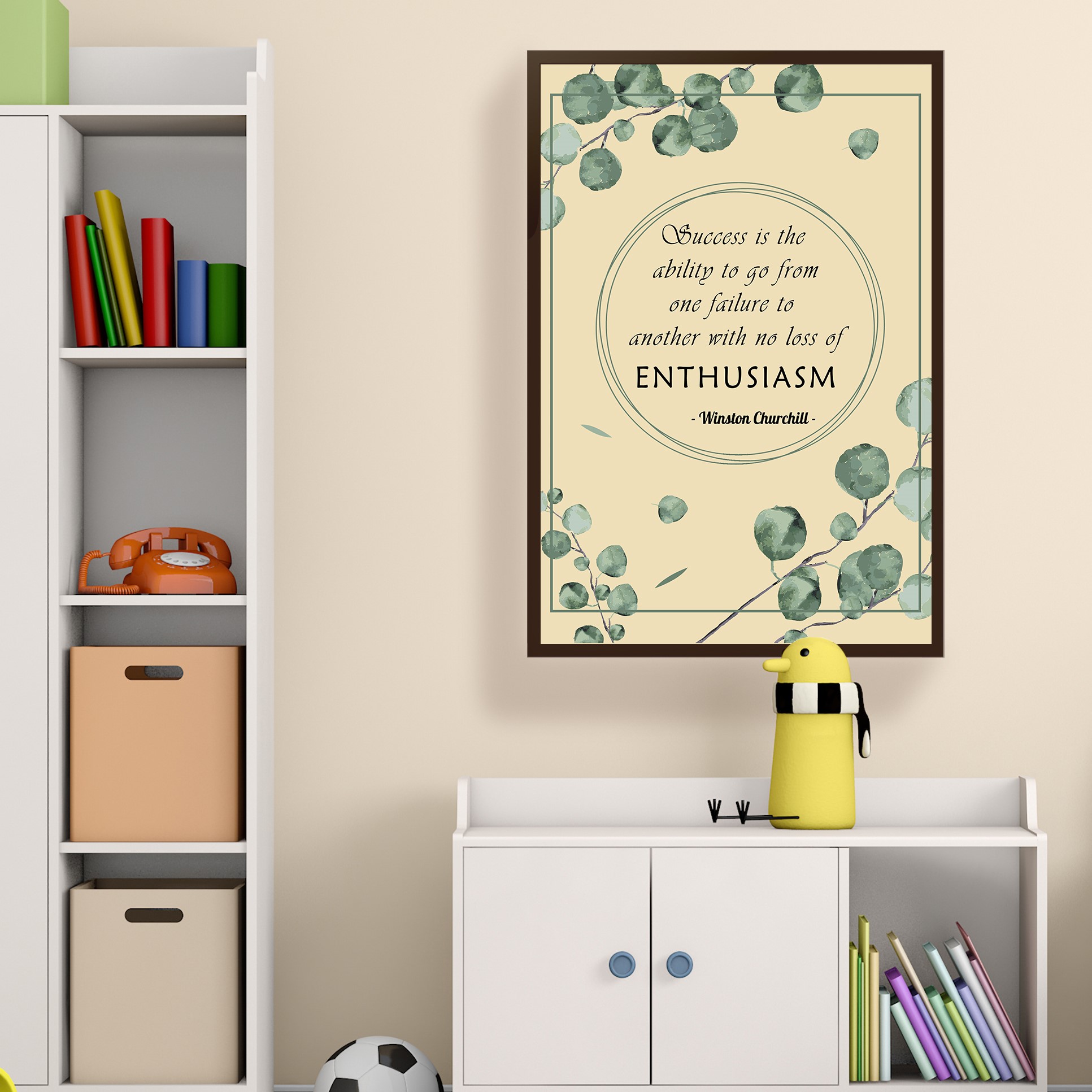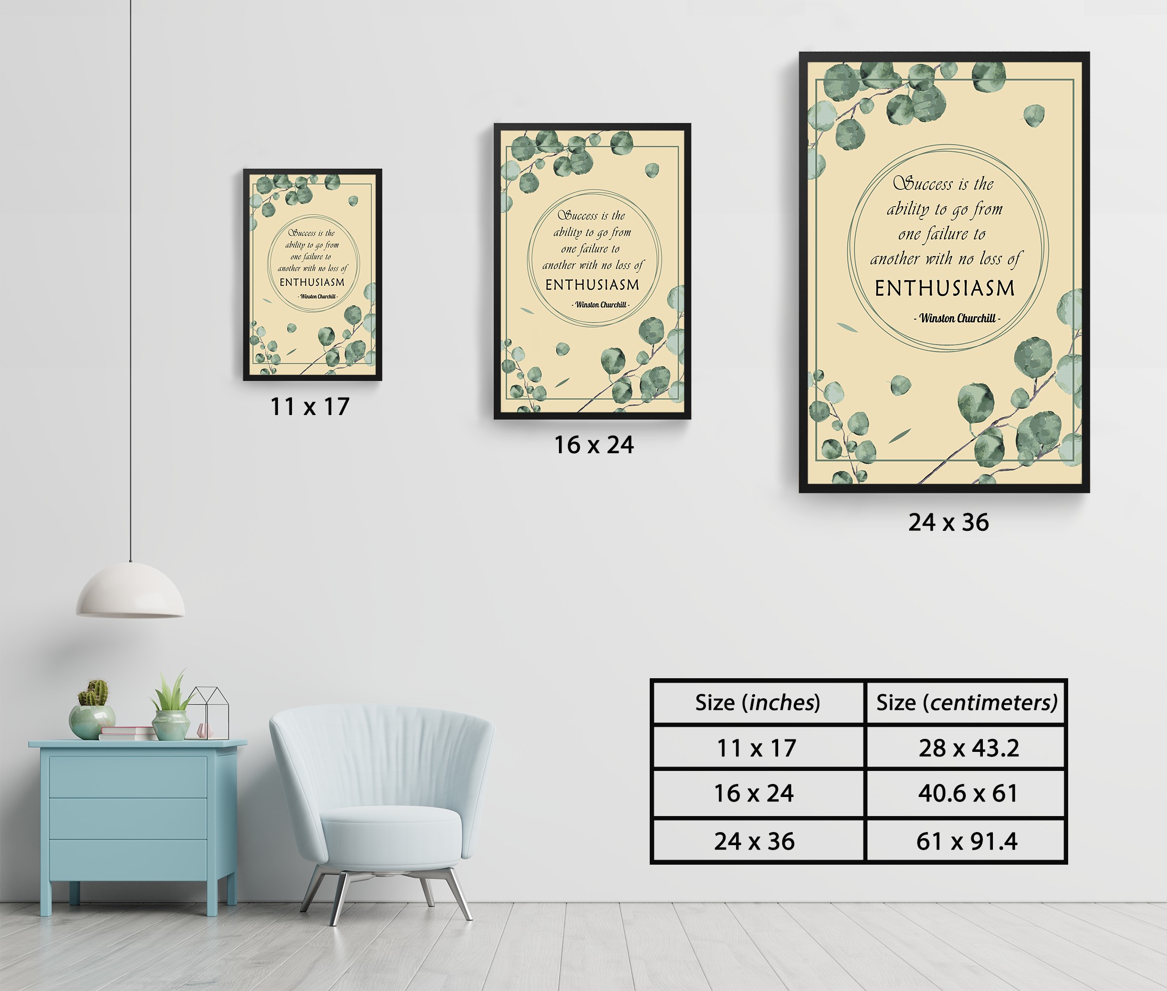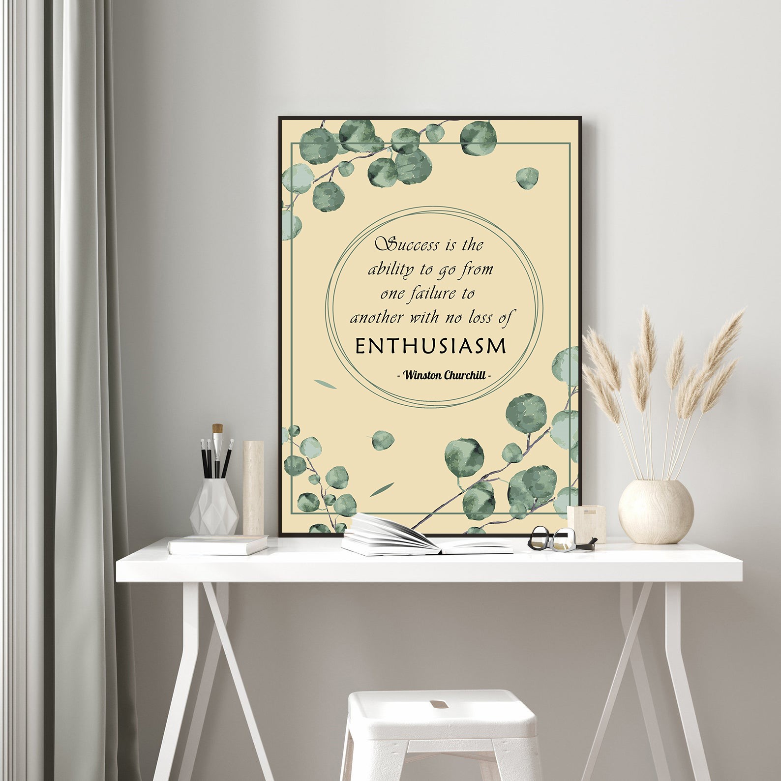 Infuse your space with resilience and optimism with this motivational wall art featuring Winston Churchill’s timeless words: “Success is the ability to go from one failure to another with no loss of enthusiasm.” This inspirational quote poster serves as a daily reminder to embrace setbacks with determination and maintain unwavering enthusiasm in the face of challenges.