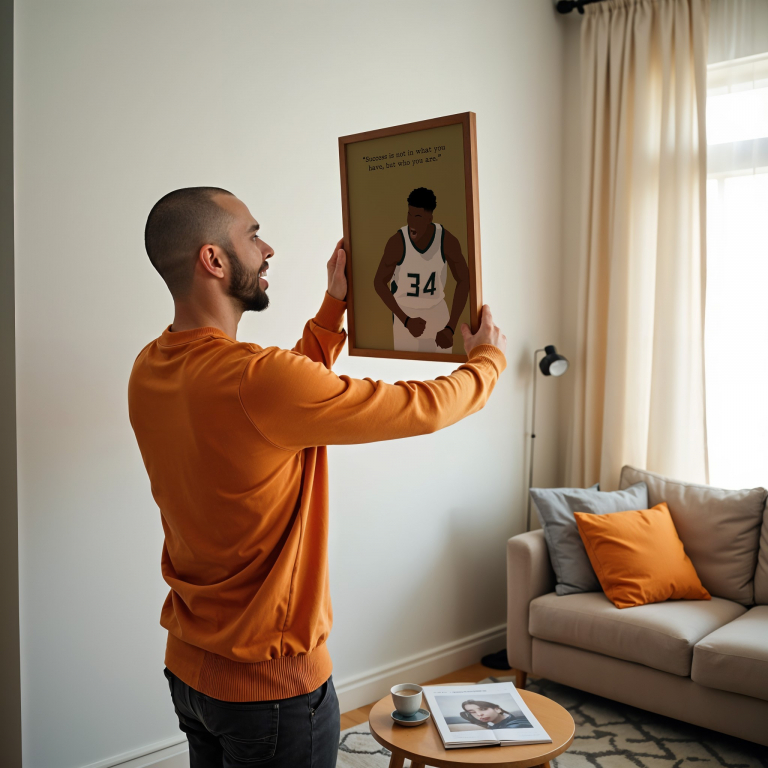 Featuring an electrifying figure mid-celebration, this artwork captures raw emotion and unshakable self-belief. Set against a muted olive background, the expressive pose and powerful quote – “Success is not in what you have, but who you are” – reflect a mindset rooted in authenticity and purpose. Perfect for fans of famous basketball player, the greek freak, and those who draw strength from perseverance.