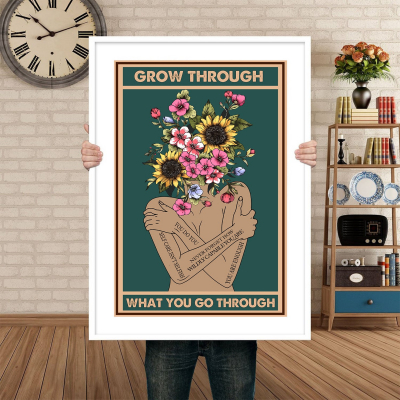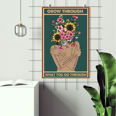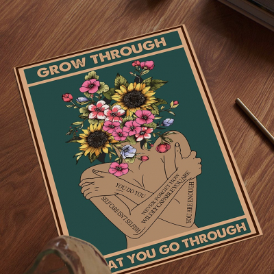 Embrace growth and resilience with this Grow Through Wall Art, a powerful representation of personal transformation and self-care. The artwork beautifully portrays a figure embracing themselves, adorned with vibrant flowers symbolizing renewal and healing. With its elegant vintage art aesthetic and deep, earthy tones, this piece serves as a daily reminder of mental health awareness and the power of perseverance.