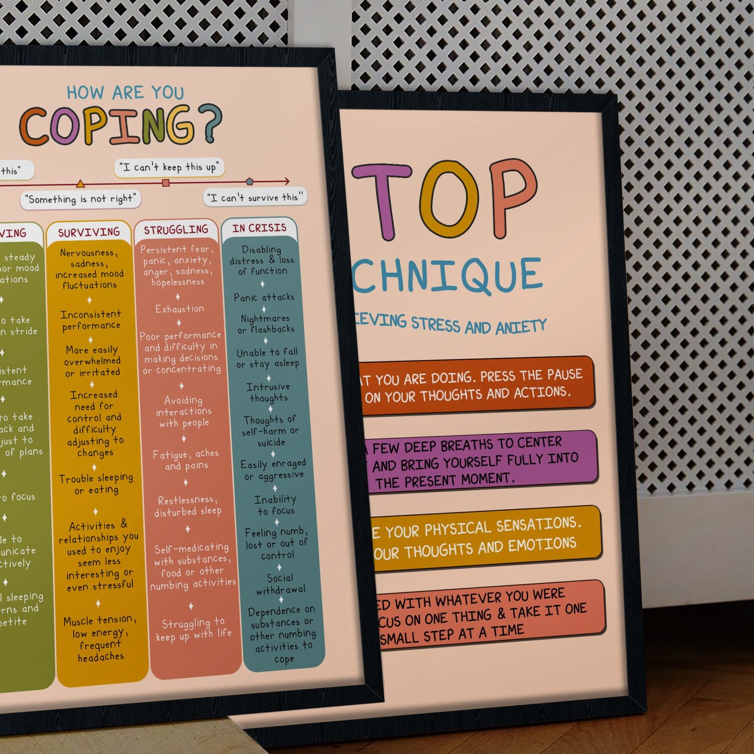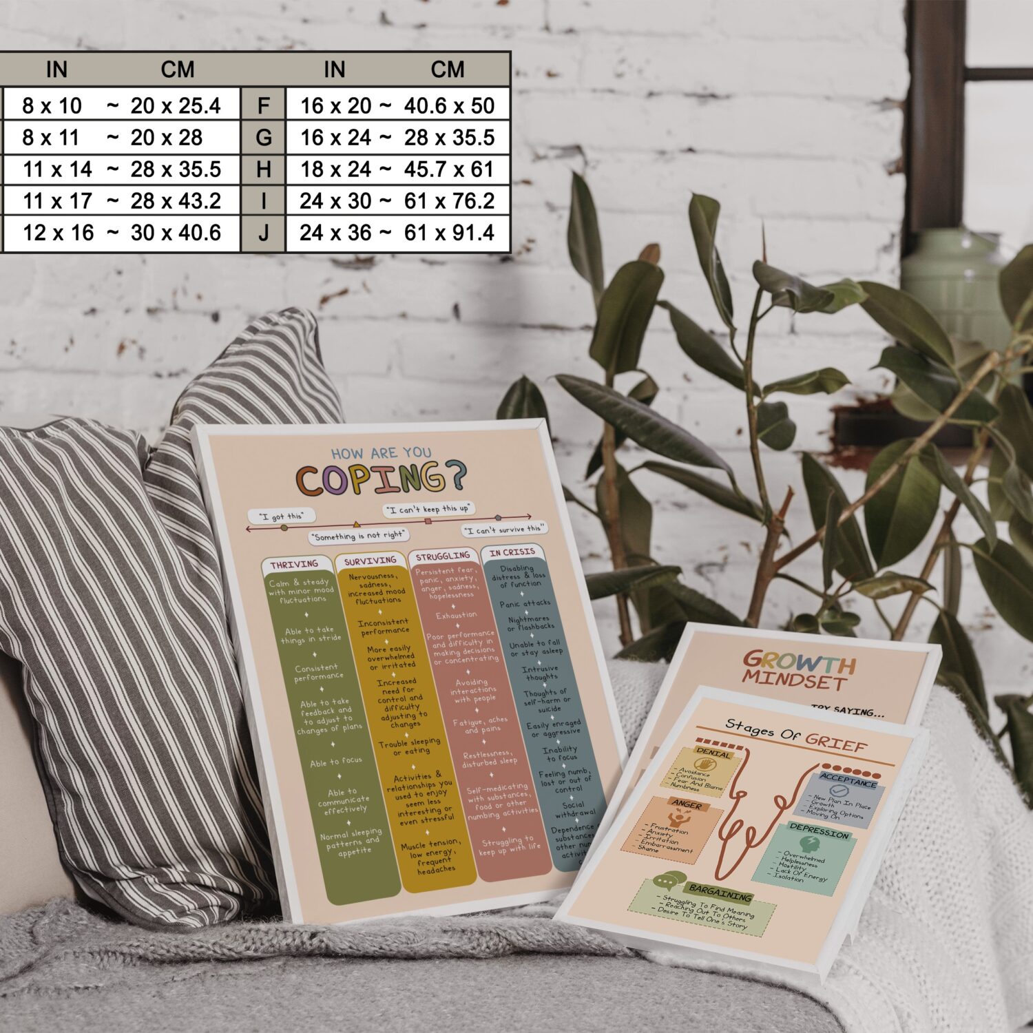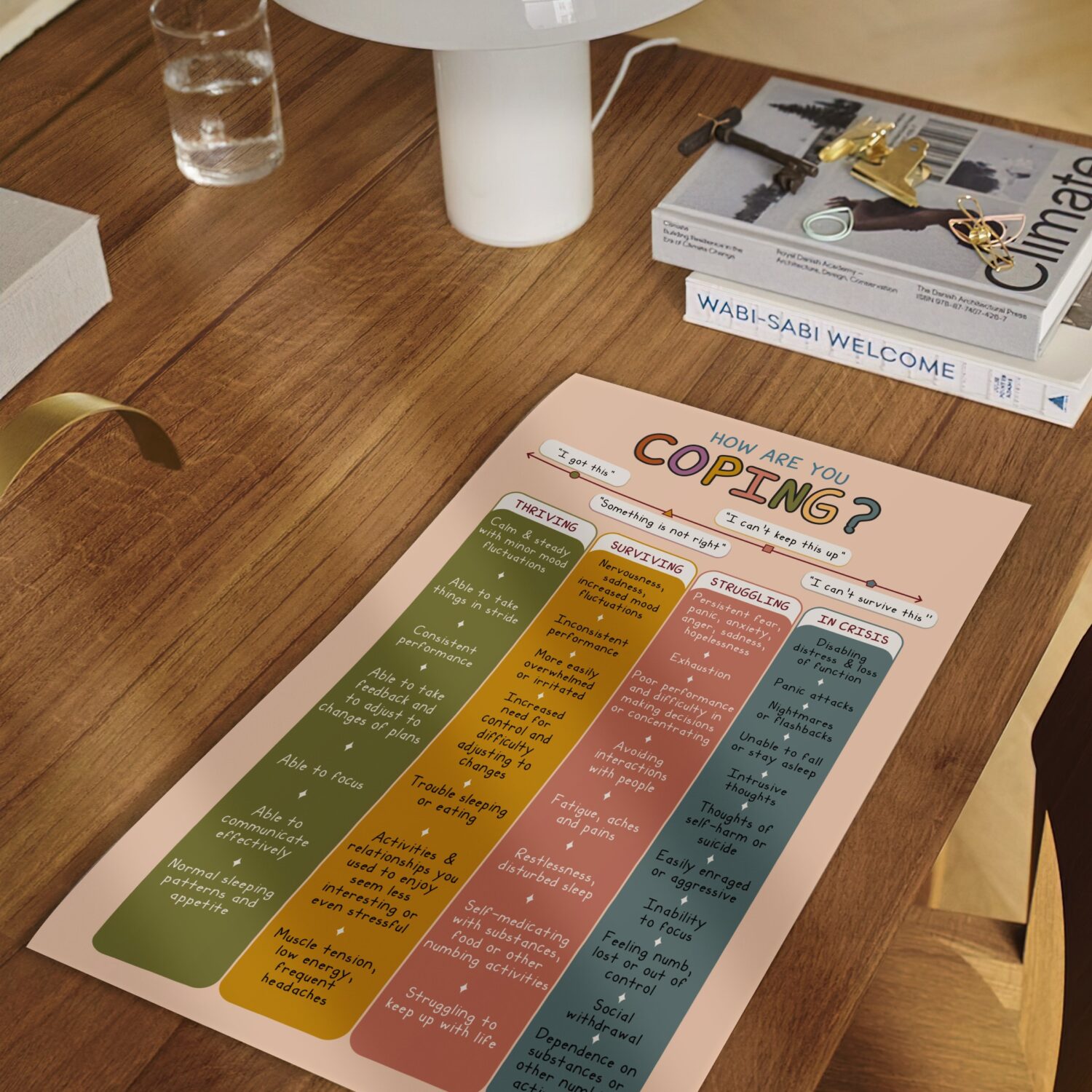 Recognizing where you are emotionally is the first step toward improving coping skills. This thoughtfully designed printable handout offers a visual guide to different coping states, from thriving to crisis. With a warm, calming aesthetic and clear categories, it helps individuals assess their well-being and identify when support may be needed.