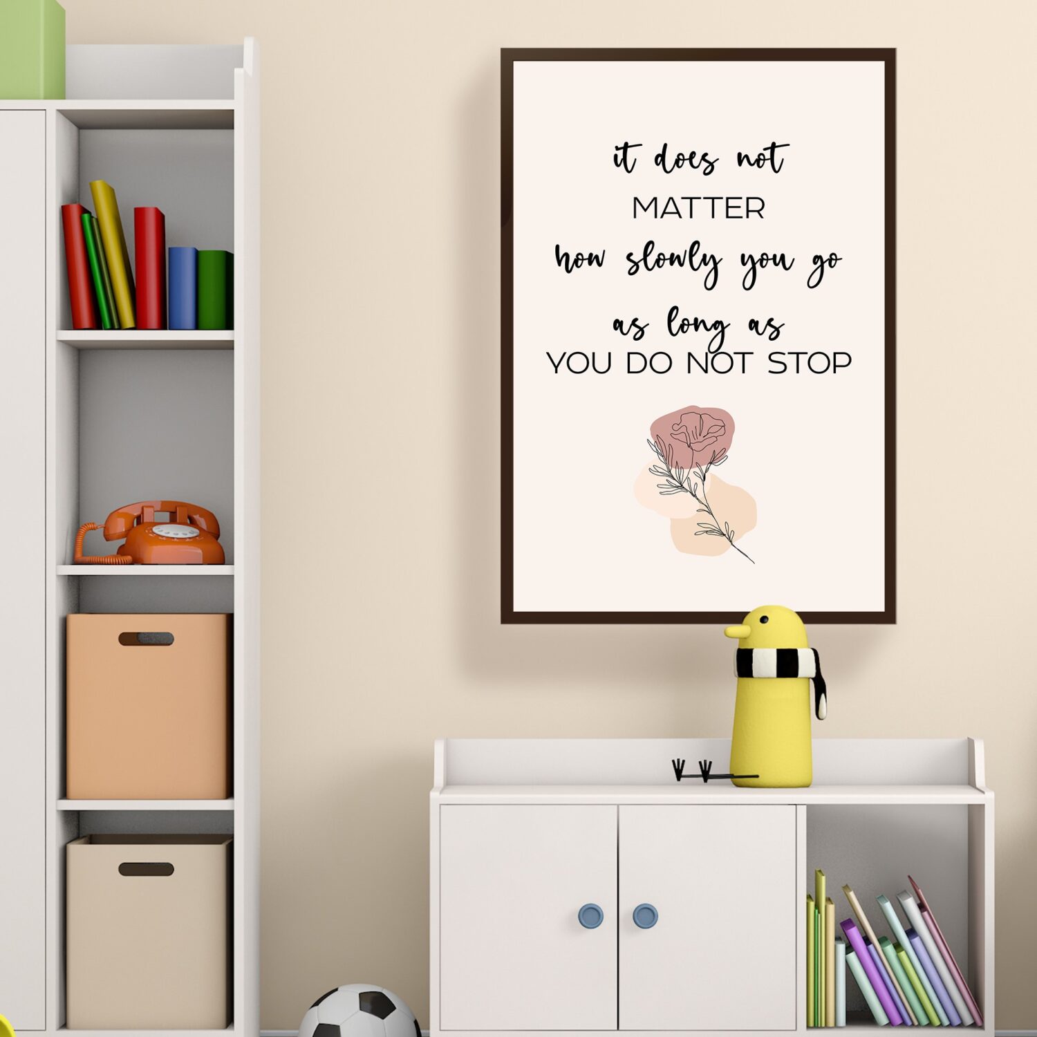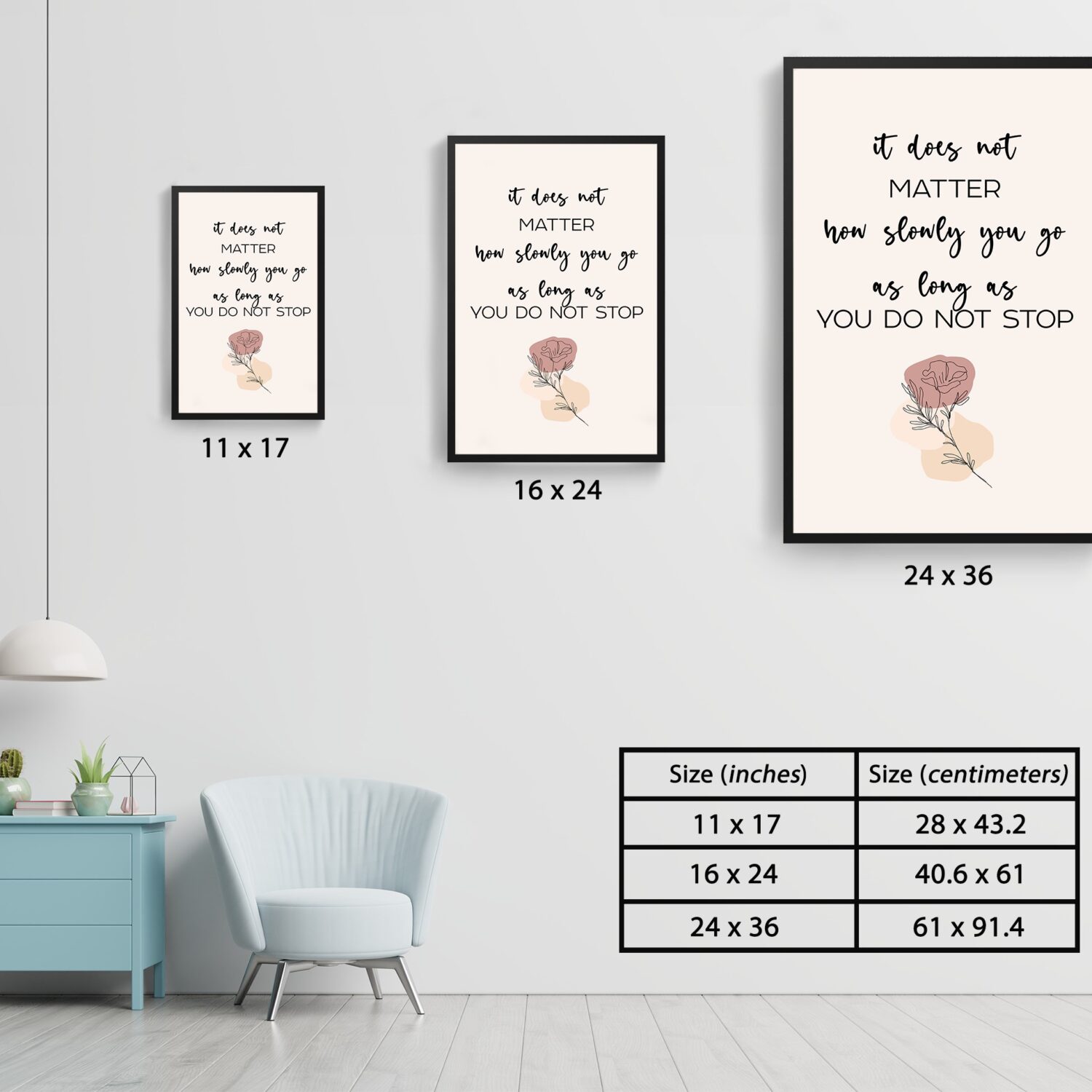 Progress isn’t about speed; it’s about perseverance. This motivational wall art features the uplifting quote, “It does not matter how slowly you go as long as you do not stop,” serving as a daily reminder to keep moving forward at your own pace. The soft beige background, elegant handwritten typography, and delicate floral line art create a calming, minimalist aesthetic perfect for any space.