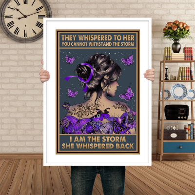 Elevate your space with this striking I Am the Storm Art Print, a symbol of empowerment and inner strength. Featuring a graceful woman with a flowing purple ribbon, surrounded by delicate butterflies and intricate floral tattoos, this artwork represents transformation, mental health awareness, and self-growth. The celestial background enhances the mystical aura, blending vintage art with modern inspiration.