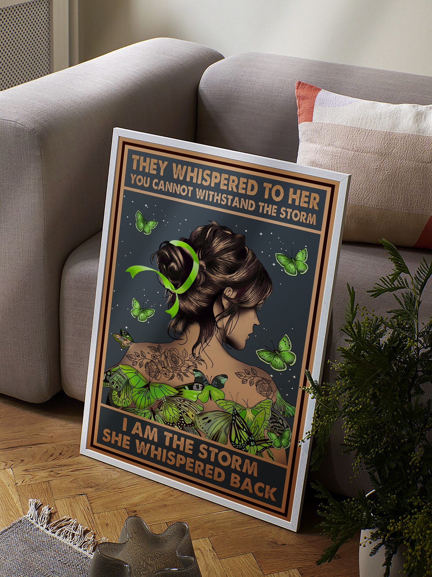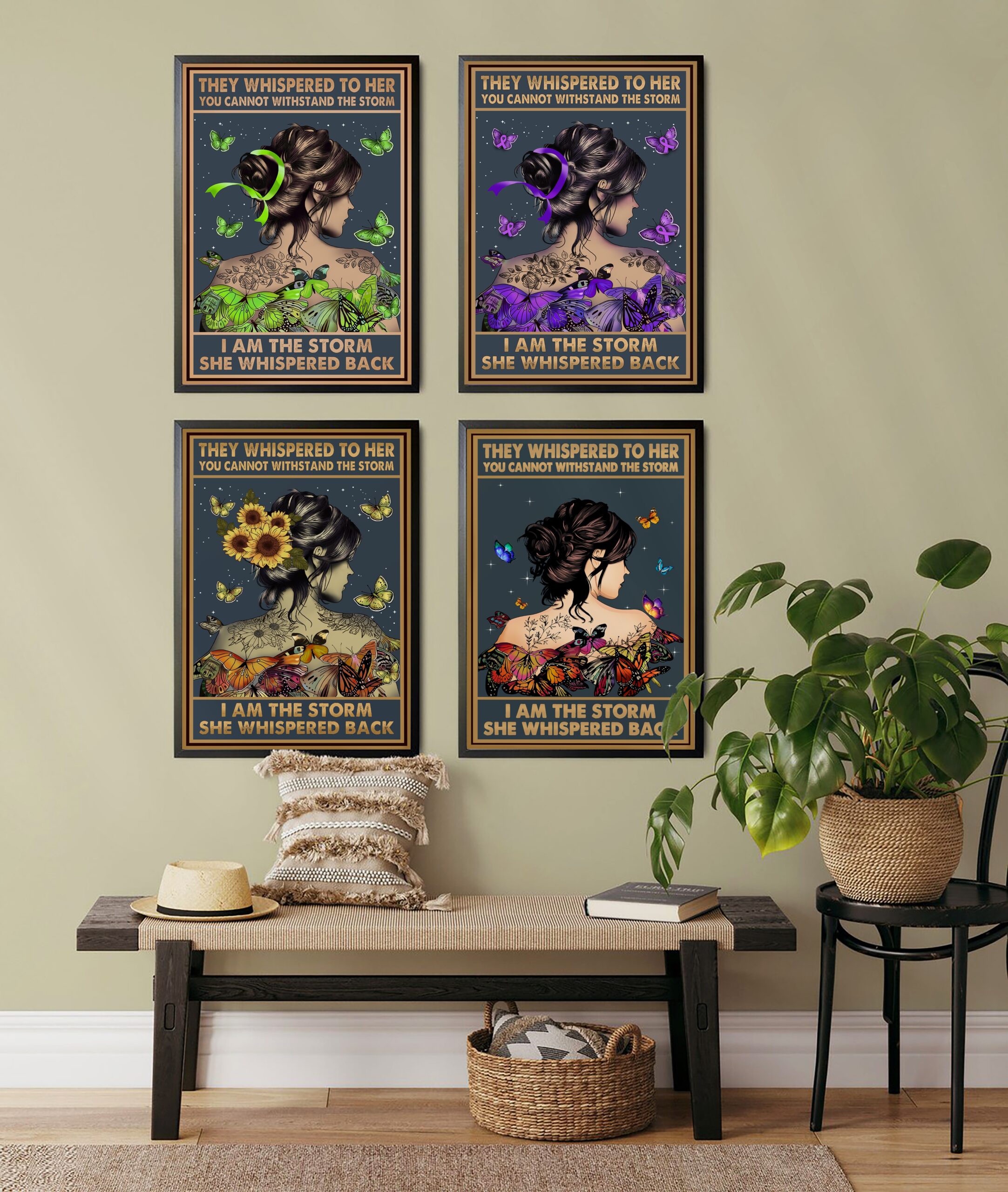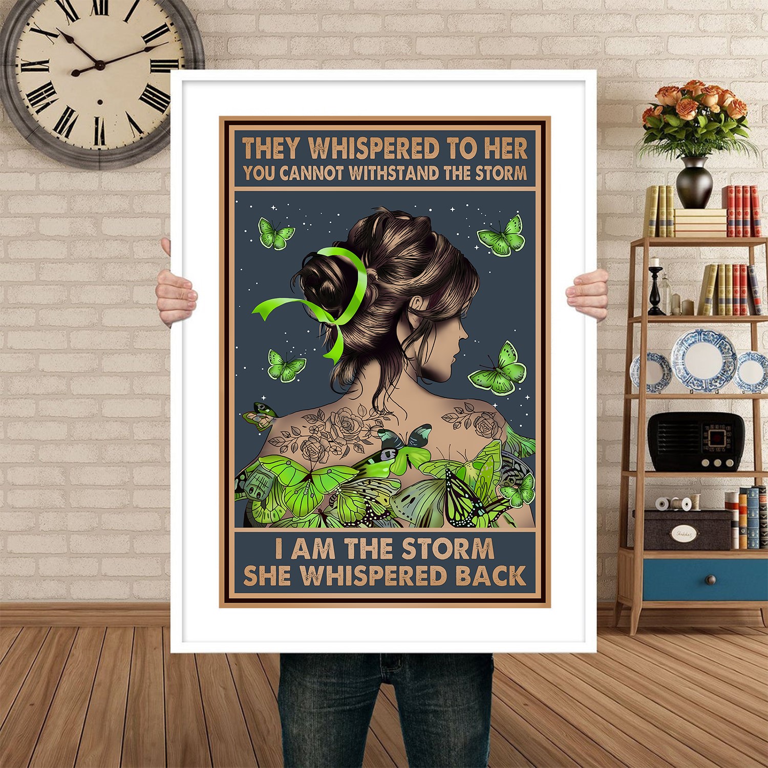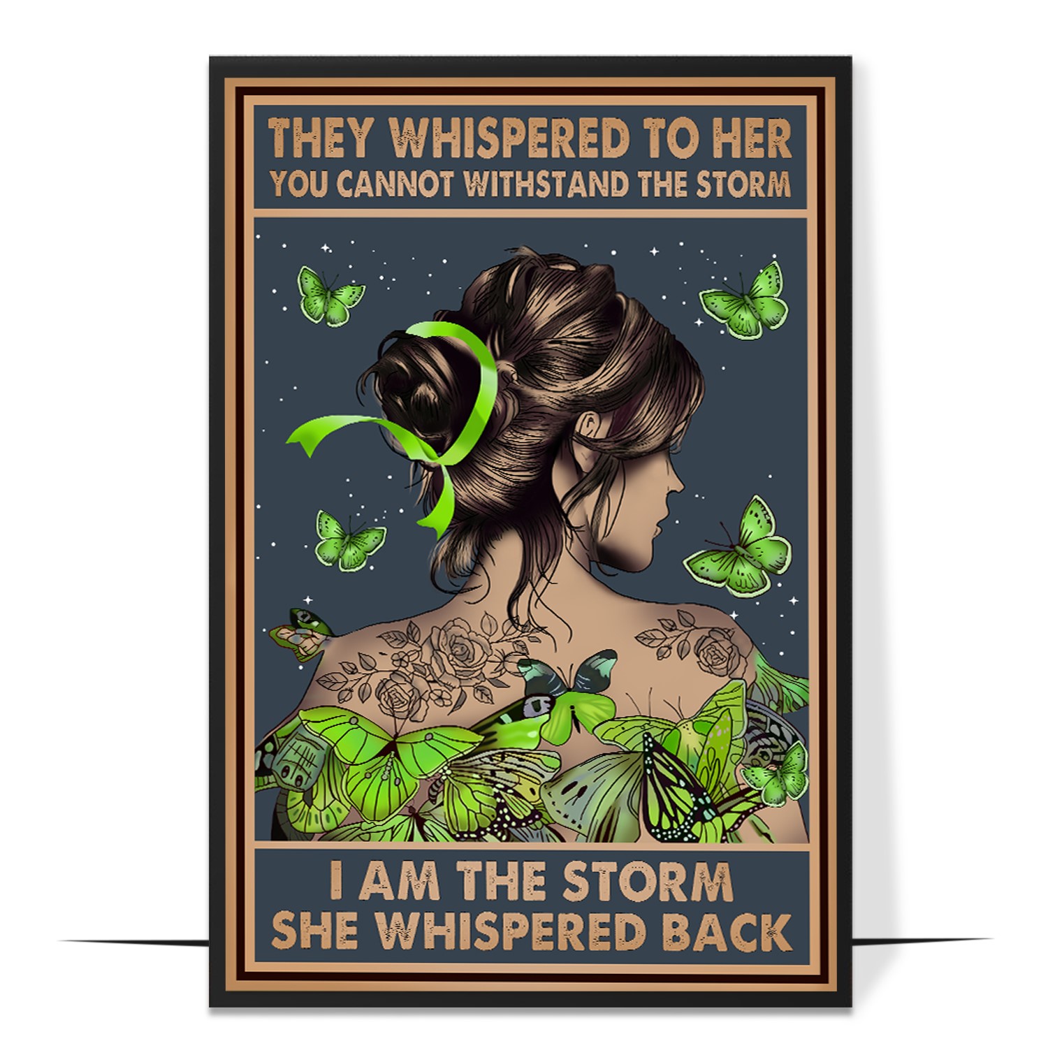 Embrace your power with this striking I Am the Storm Printable, designed to inspire confidence and perseverance. Featuring an elegant woman adorned with lush green butterflies, floral tattoos, and a flowing ribbon, this artwork symbolizes transformation, mental health awareness, and inner strength. The deep celestial background adds a sense of mystery and depth, creating a perfect balance of vintage art and modern inspiration.