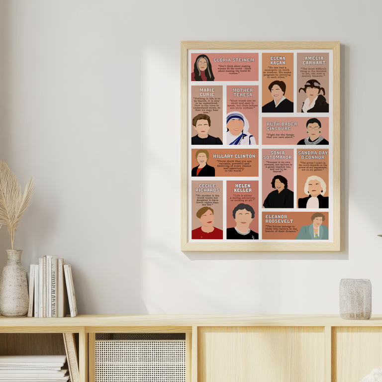 Honor courage, brilliance, and progress with this inspiring learning poster featuring iconic women from history. With bold, minimalist illustrations and warm color tones, this artwork showcases influential leaders – each quote a tribute to women’s rights, education, and social justice.