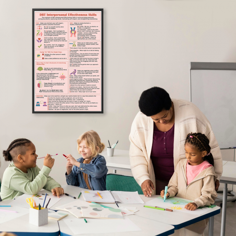 Interpersonal Effectiveness dbt mental health art print can serve as a fantastic visual. Ideal for therapists, counselors, psychologists, teachers, and parents.
