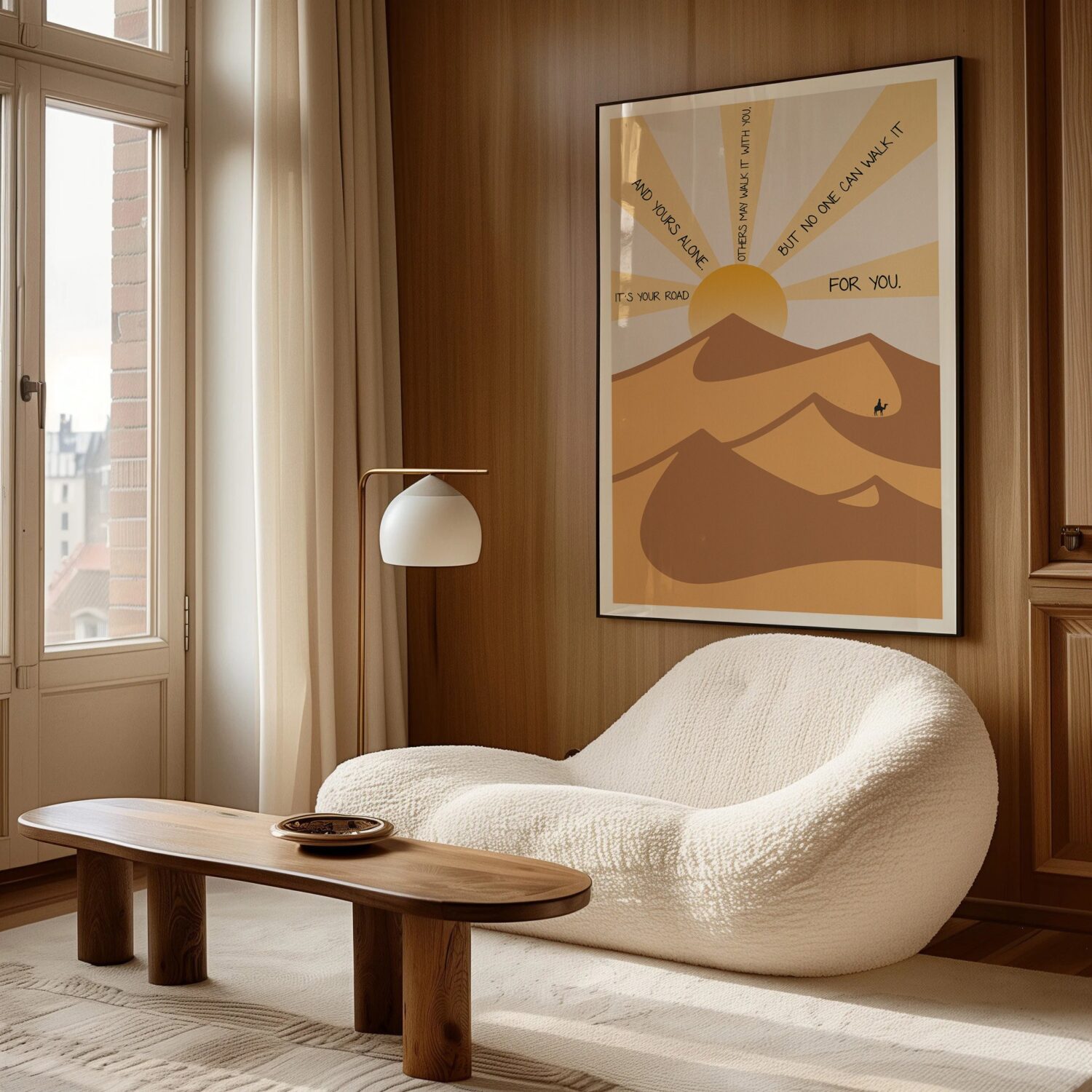 Embrace self-discovery and personal growth with this stunning rumi quote poster. Featuring the profound words, “It’s your road, and yours alone. Others may walk it with you, but no one can walk it for you,” this piece serves as a daily reminder of self-reliance, strength, and perseverance.