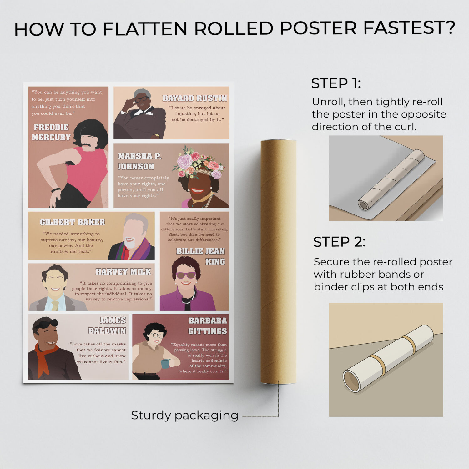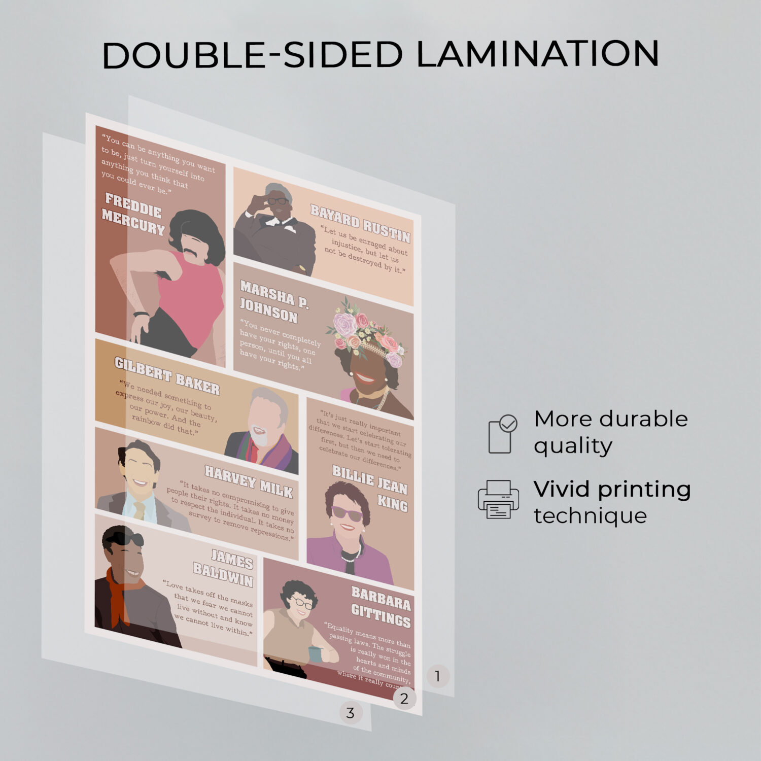 Celebrate strength, identity, and progress with this vibrant LGBTQ poster featuring historic diverse leaders and their empowering words. Illustrated in a warm, modern style, each figure radiates purpose and pride – reminding us of the power of voice and visibility.