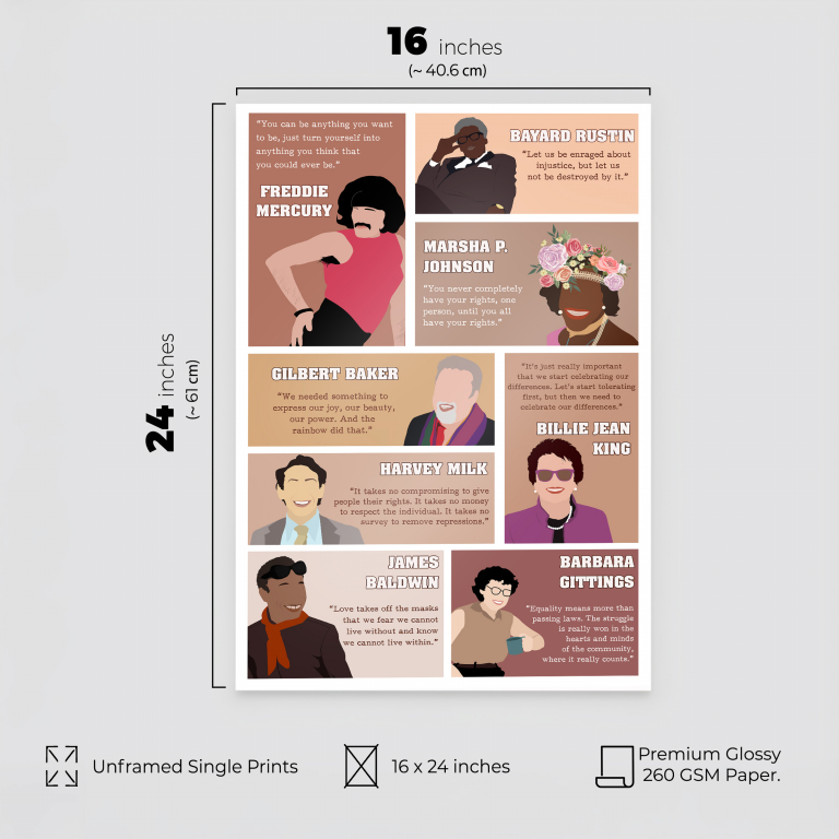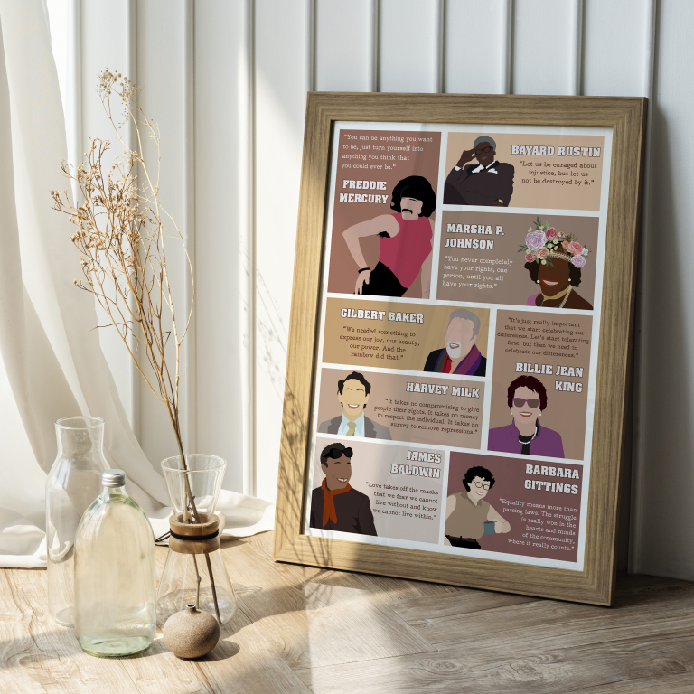 Celebrate strength, identity, and progress with this vibrant LGBTQ poster featuring historic diverse leaders and their empowering words. Illustrated in a warm, modern style, each figure radiates purpose and pride – reminding us of the power of voice and visibility.