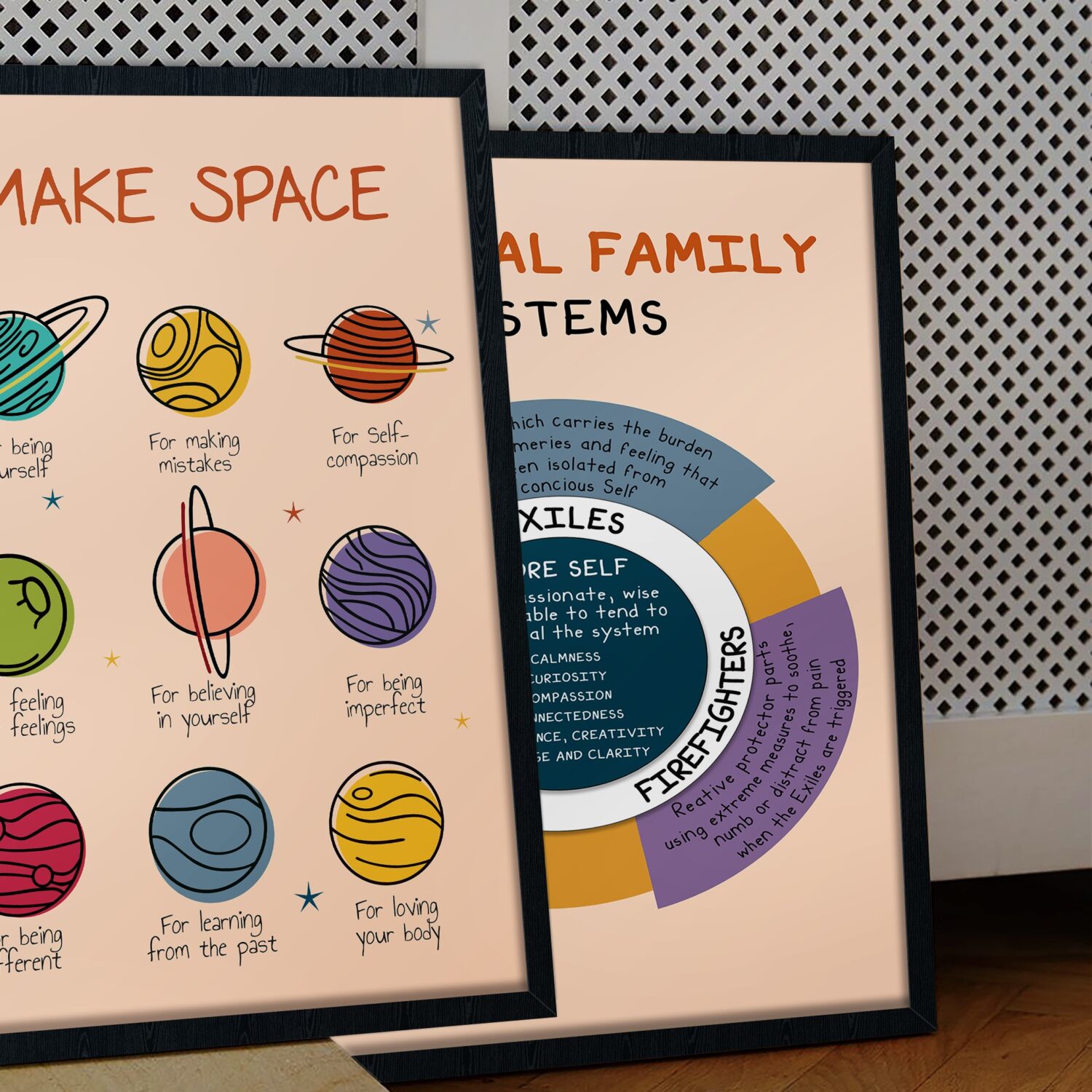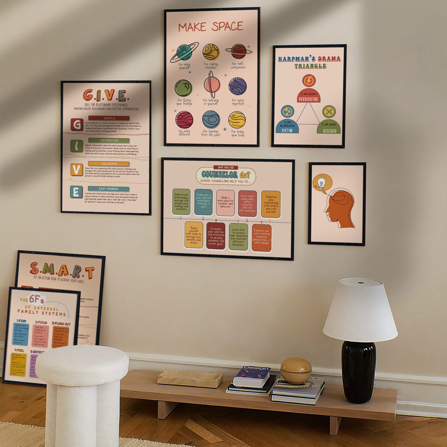 - Calming Aesthetic – Features soothing tones and planetary illustrations, making it ideal for a relaxing therapy or counseling space.