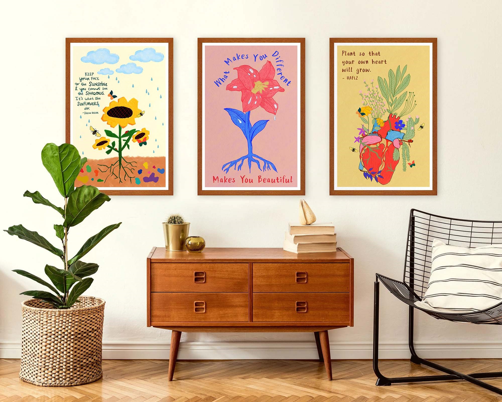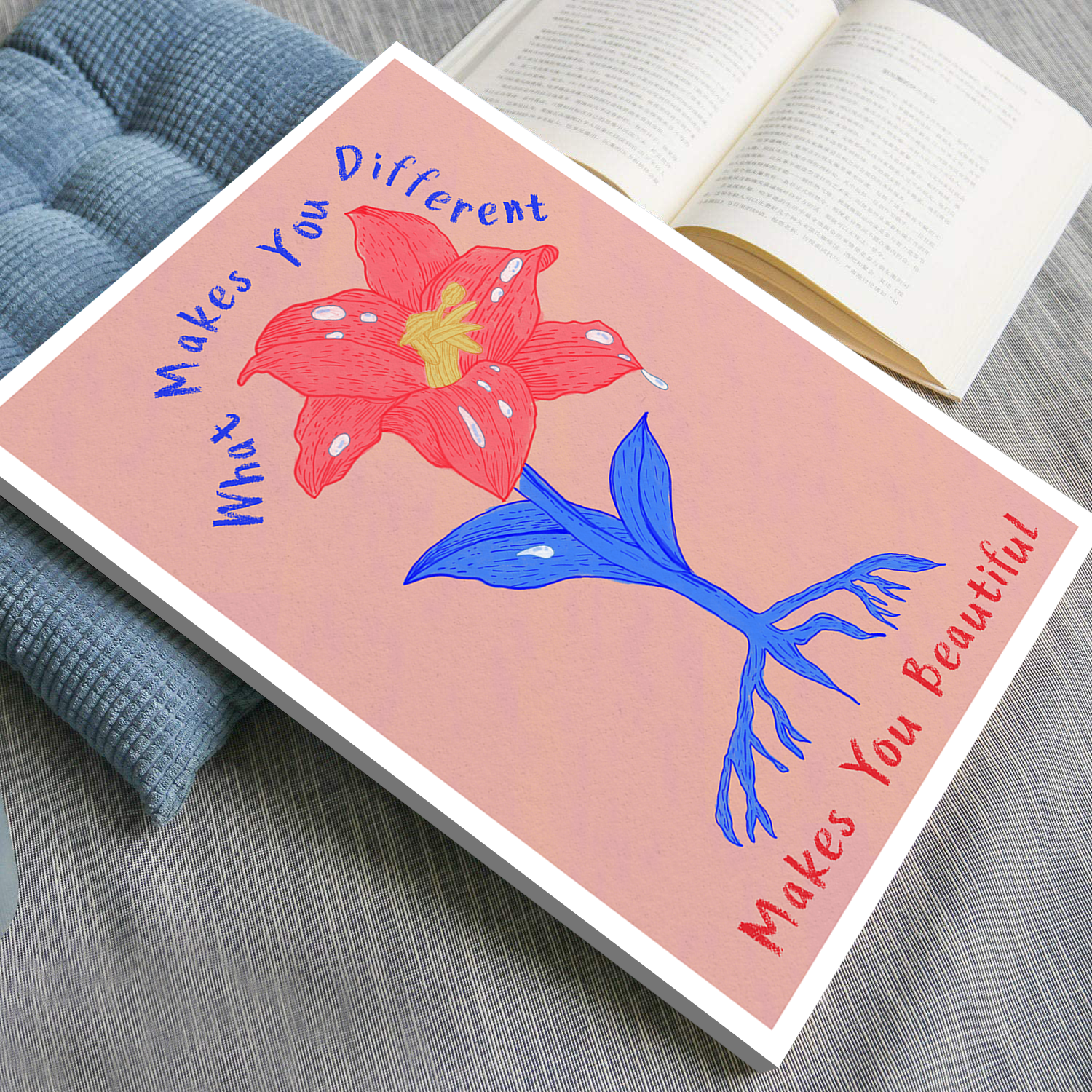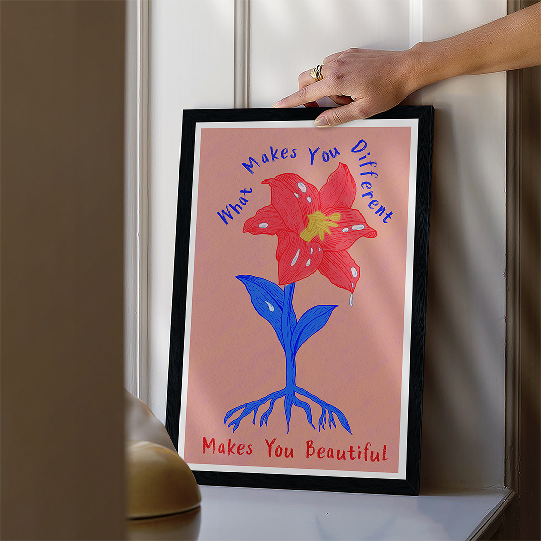 Embrace your individuality with this inspiring, colorful mental health poster, reminding us that our differences are what make us beautiful. The artwork features a striking red flower with delicate white raindrops, rooted in bold blue stems, symbolizing resilience, self-acceptance, and growth. With its uplifting message and vibrant aesthetic, this therapy art piece encourages confidence and positivity in every glance.