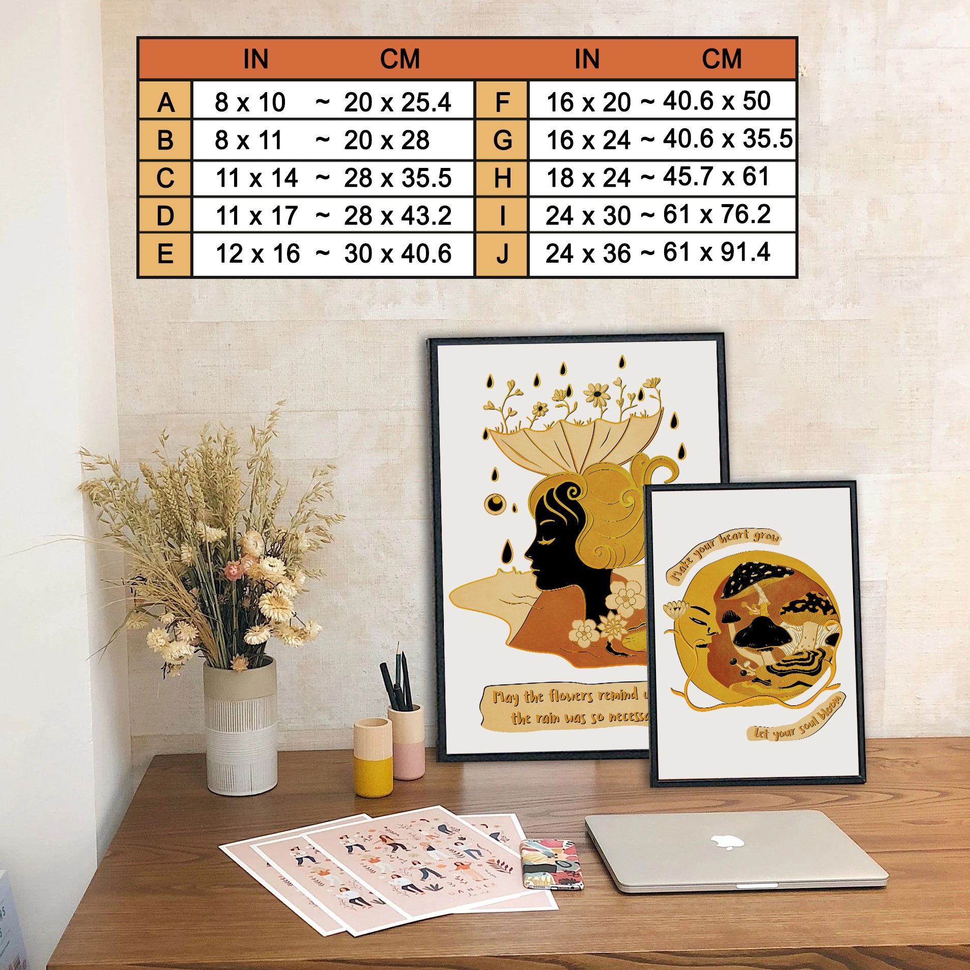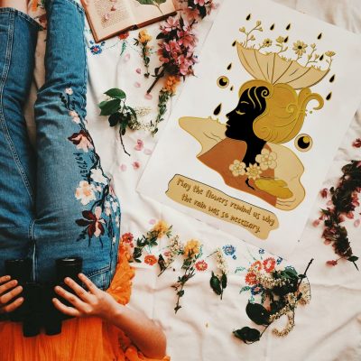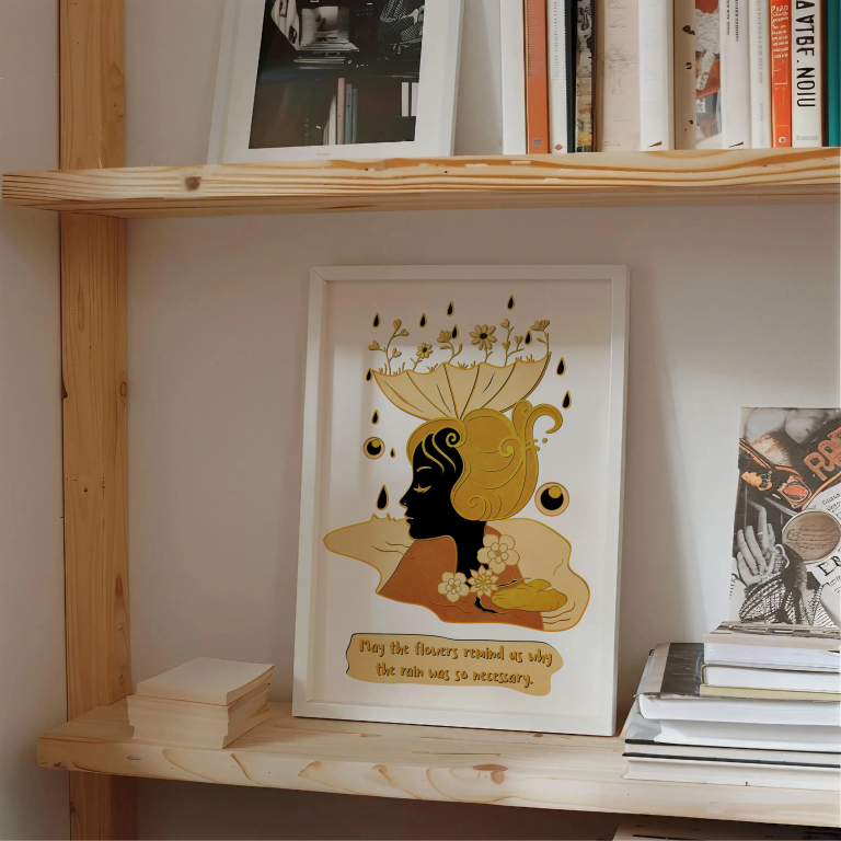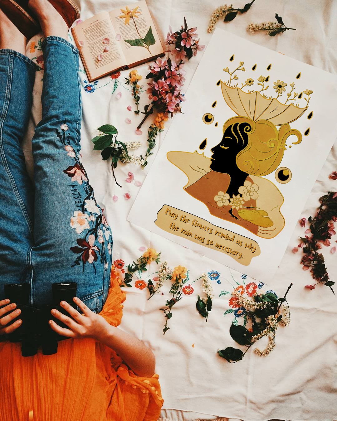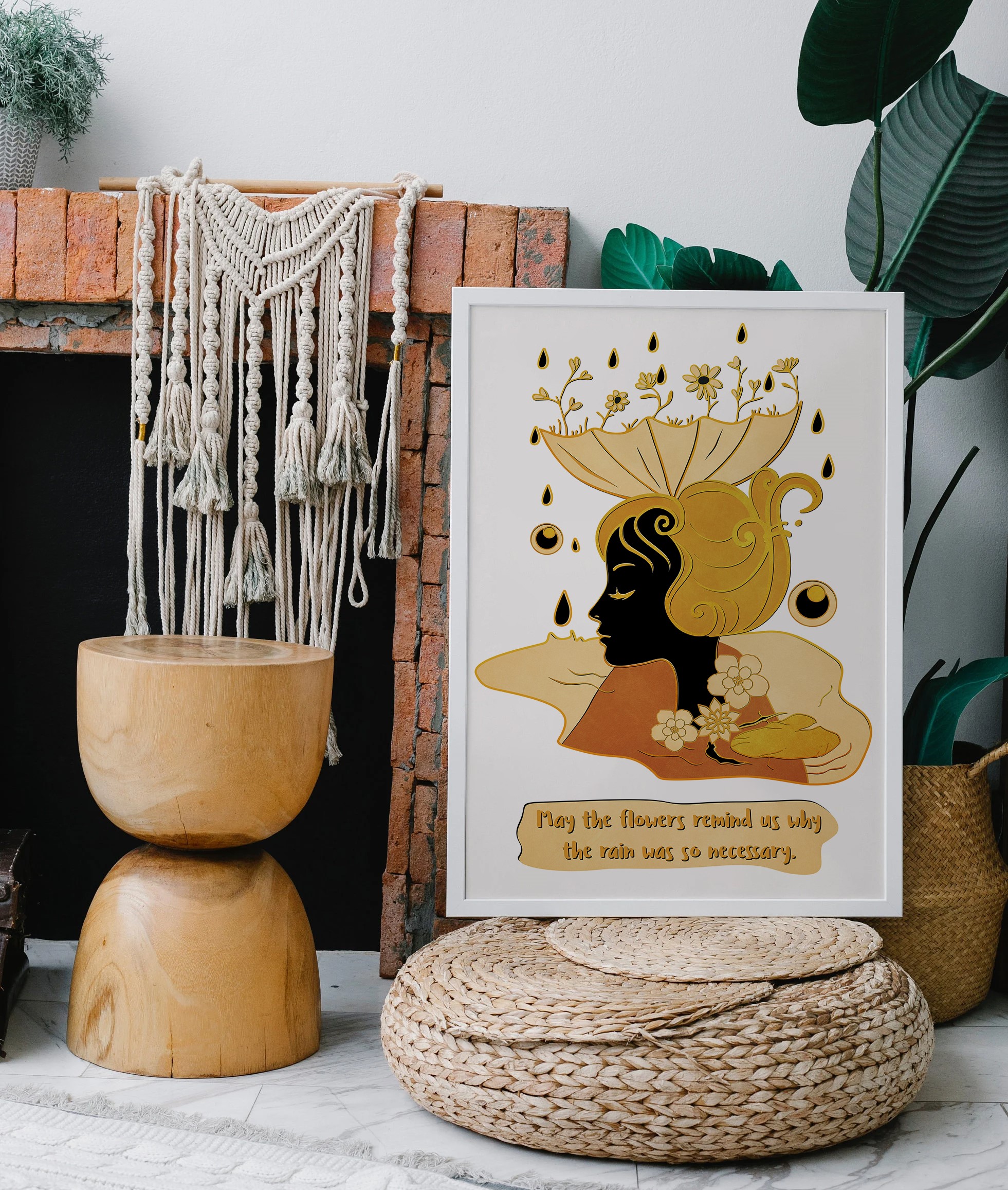 Embrace the beauty of transformation with this psychedelic art piece that blends hippie aesthetics with profound wisdom. Featuring a golden-hued figure with blooming flowers emerging from a storm, this artwork symbolizes resilience, growth, and the power of perspective. The quote, “May the flowers remind us why the rain was so necessary,” serves as a gentle positive affirmation to embrace challenges as part of the journey.