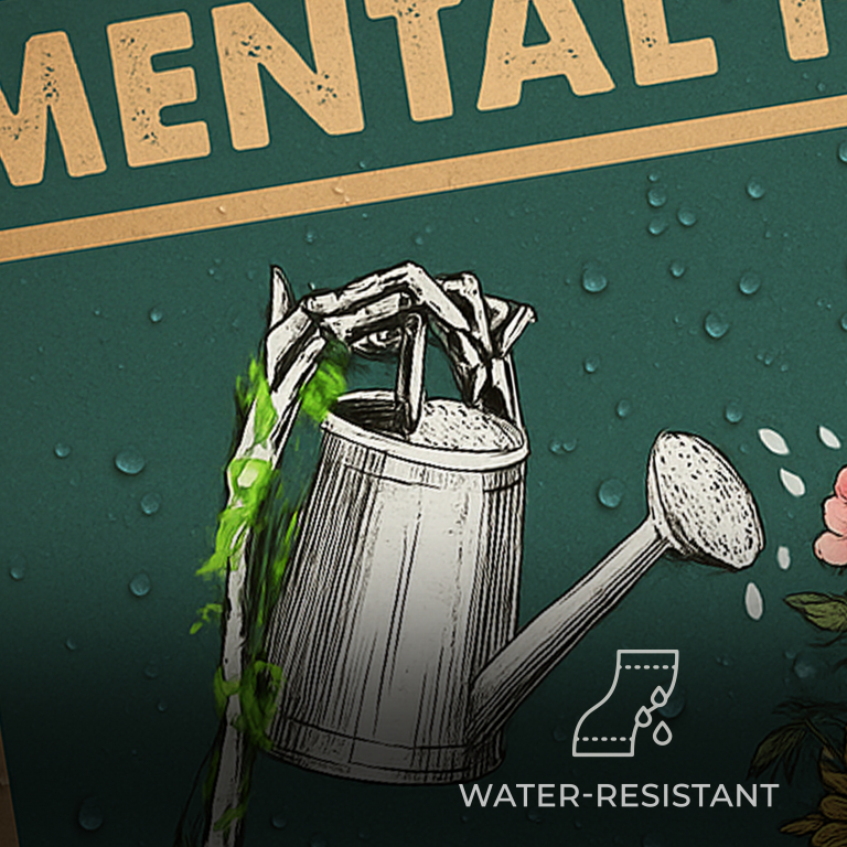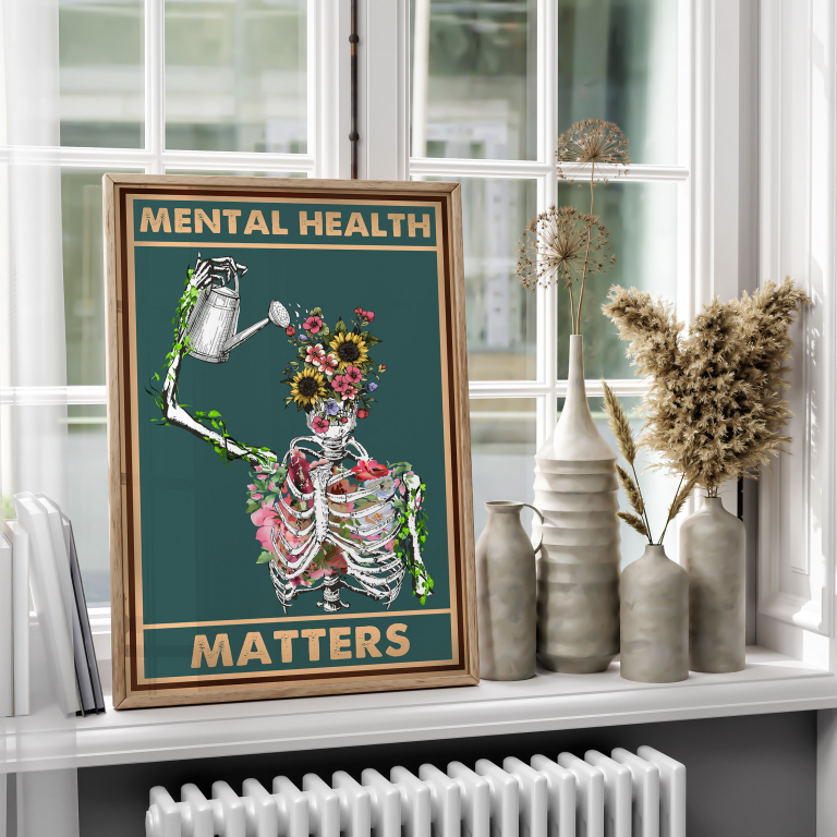 Celebrate healing and self-growth with this striking mental health awareness print. Featuring a skeletal figure blooming with flowers and watering its own mind, the artwork blends vintage art with modern meaning – a bold reminder that growth mindset begins within. The design brings both beauty and affirmation to any wall it graces.