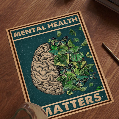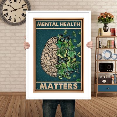 Embrace the journey of self-care with this Mental Health Matters Art Print, a striking representation of mental health awareness and resilience. The artwork features a detailed half-brain illustration, where one side is grounded in realism while the other transforms into a vibrant cascade of green butterflies. This powerful visual metaphor speaks to the beauty of healing, personal growth, and transformation. With its vintage art style and deep, earthy tones, this piece adds both depth and inspiration to any mindful space.