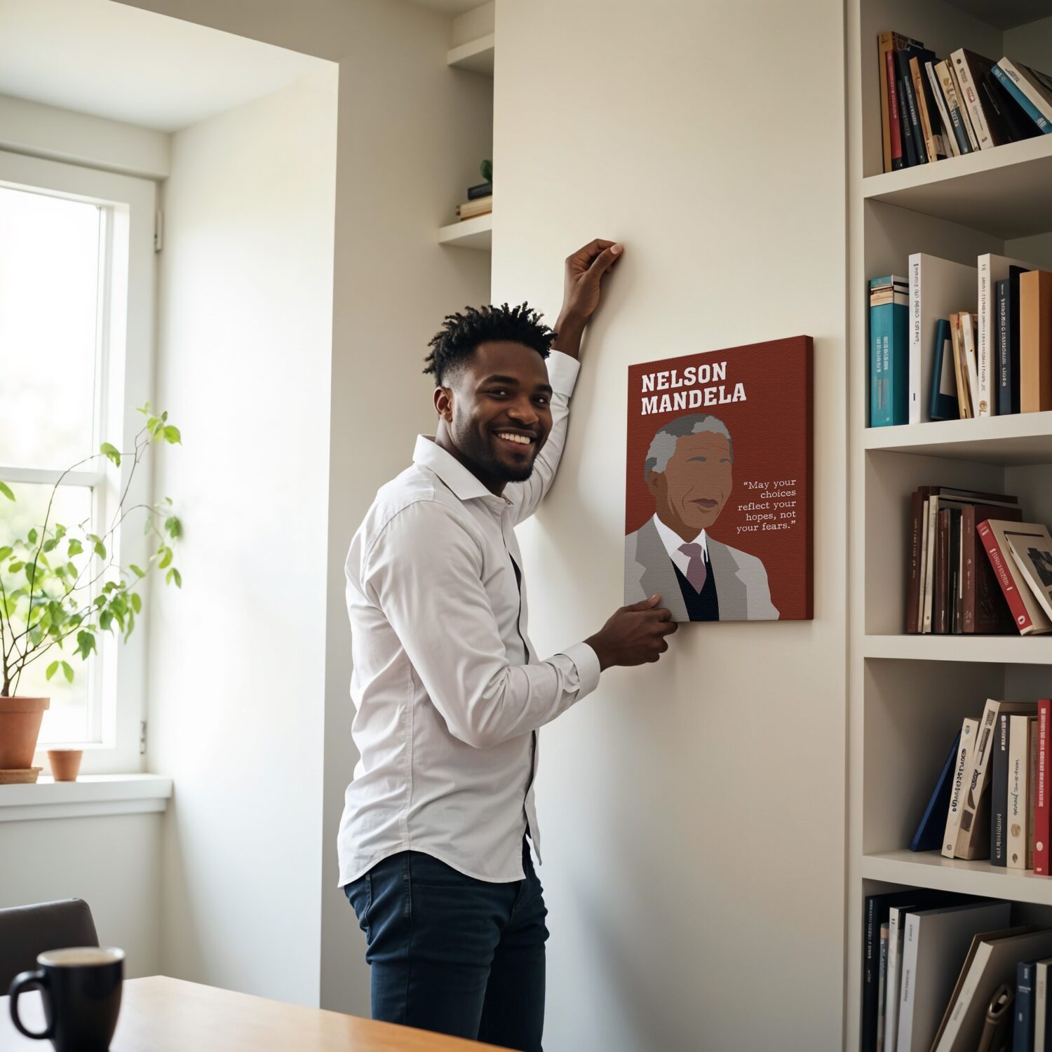 This bold Nelson Mandela wall art showcases a simplified yet powerful portrait alongside one of the most heartfelt inspirational quotes in modern history. Created for spaces that honor reflection and learning, it serves as a daily reminder to lead with intention and choose hope over fear. A perfect tribute for Black History Month and beyond.