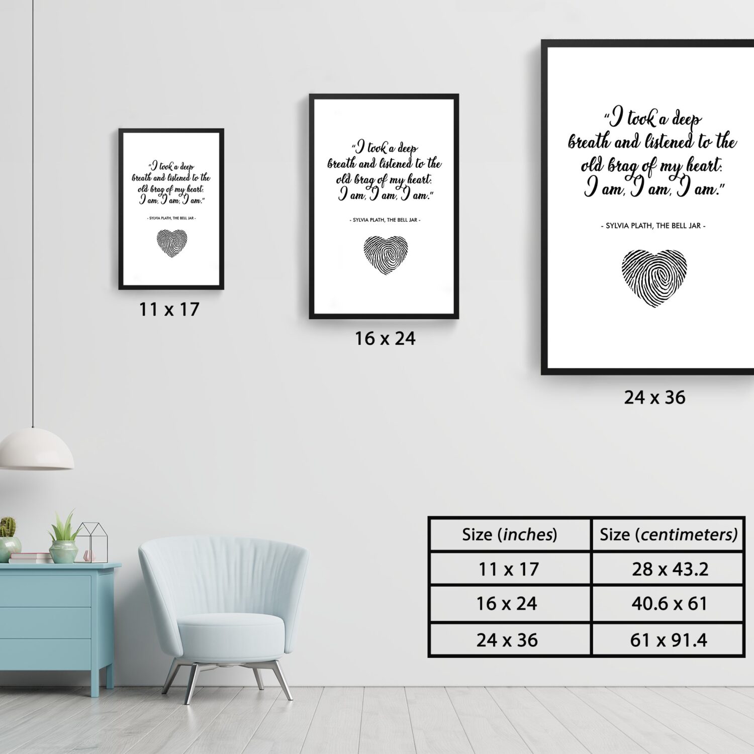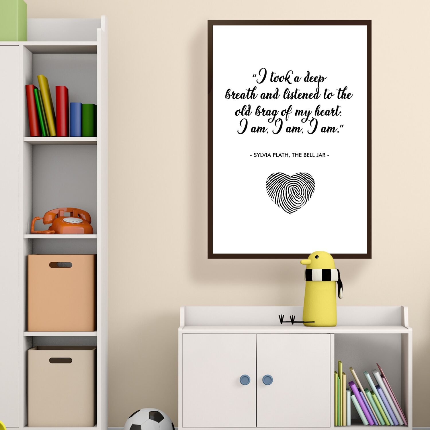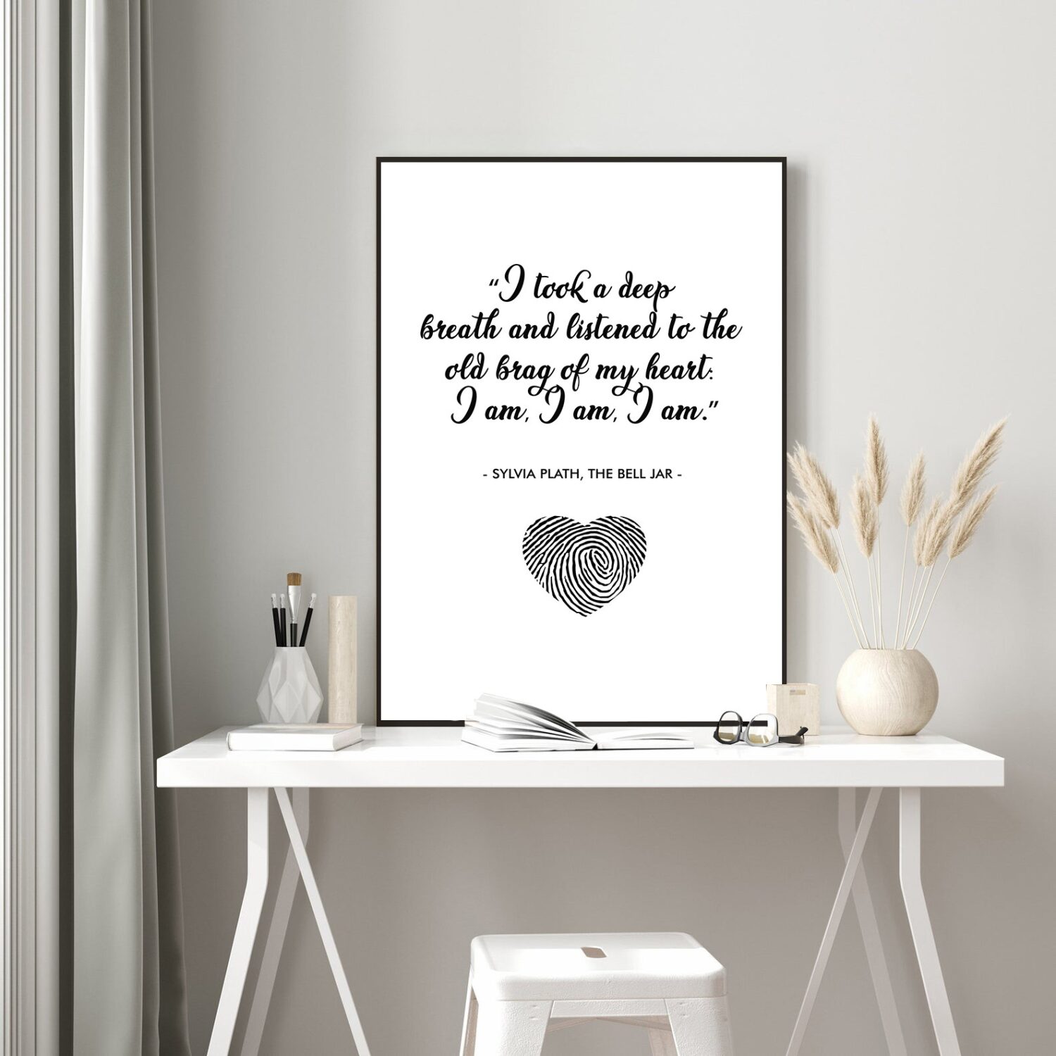 Celebrate the power of self-awareness and resilience with this inspiring quote from Sylvia Plath’s The Bell Jar. “I took a deep breath and listened to the old brag of my heart: I am, I am, I am.” A timeless affirmation of existence, strength, and self-discovery, this motivational wall art serves as a daily reminder of your inner power.
