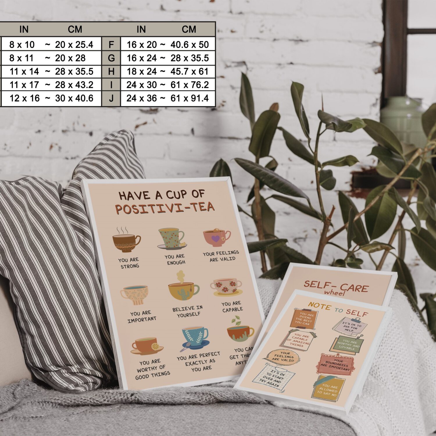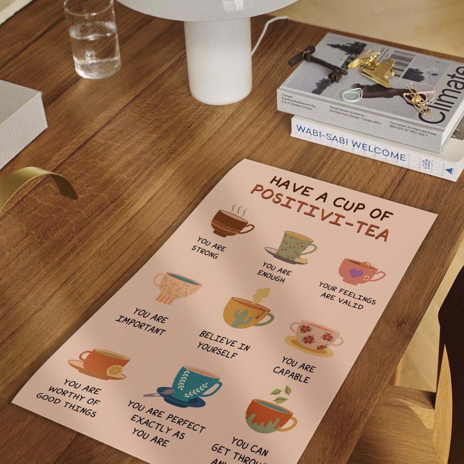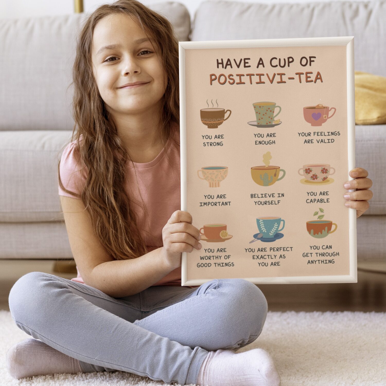 Start your day with a dose of encouragement from this charming Positivi-Tea Affirmation Poster. Featuring beautifully illustrated teacups paired with uplifting positive affirmations, this mental health poster is designed to inspire self-love, resilience, and confidence.