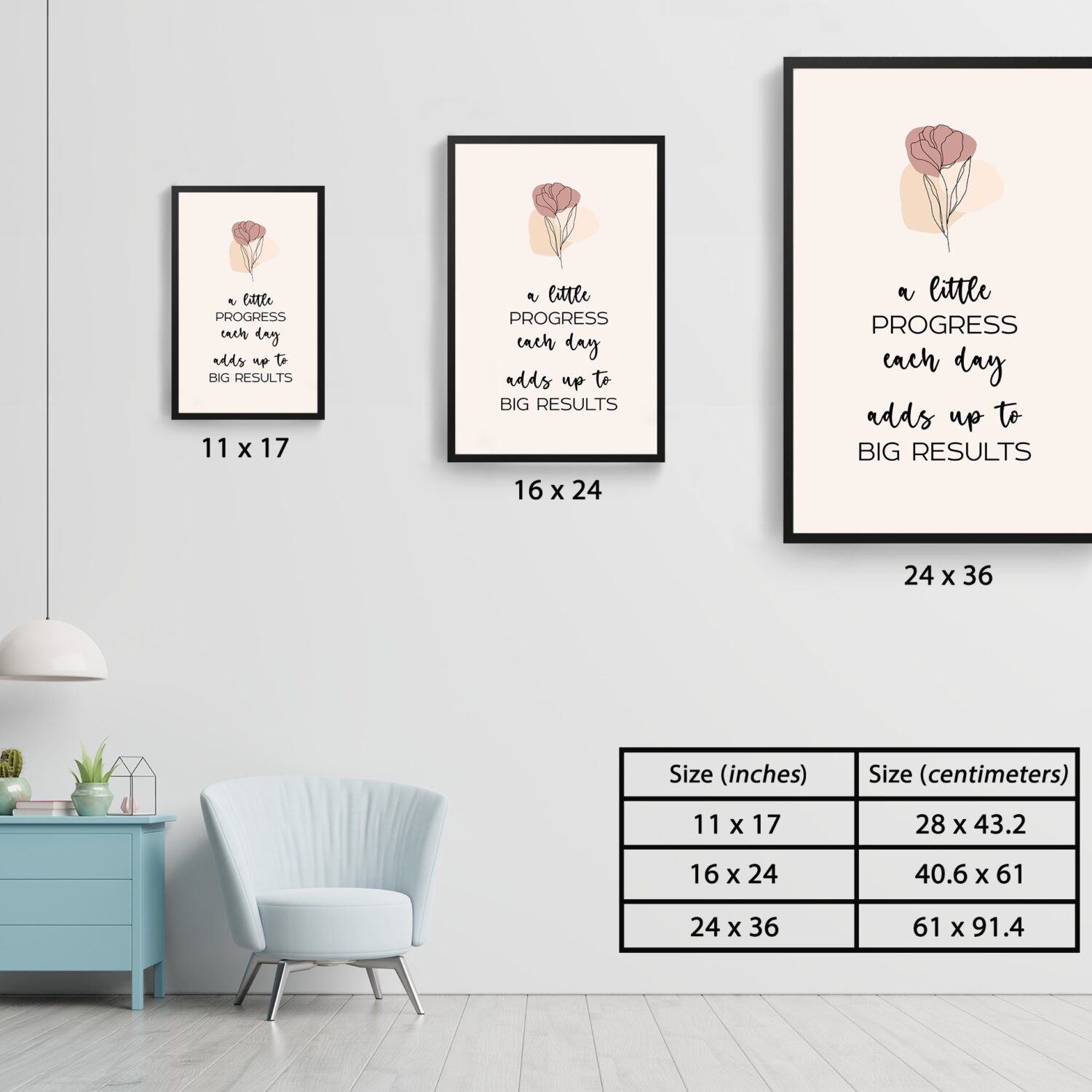 Small steps lead to great achievements. This motivational wall art features the inspiring quote, “A little progress each day adds up to big results,” reminding you that steady effort leads to meaningful change. Designed with soft, neutral tones, elegant script, and delicate floral line art, this piece brings a sense of warmth and encouragement to any space.