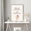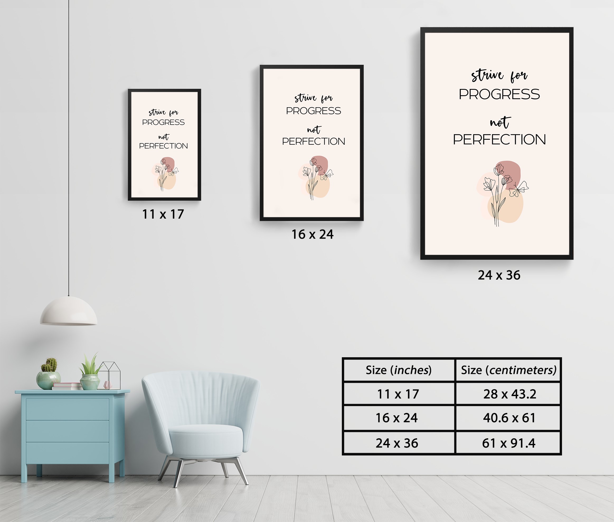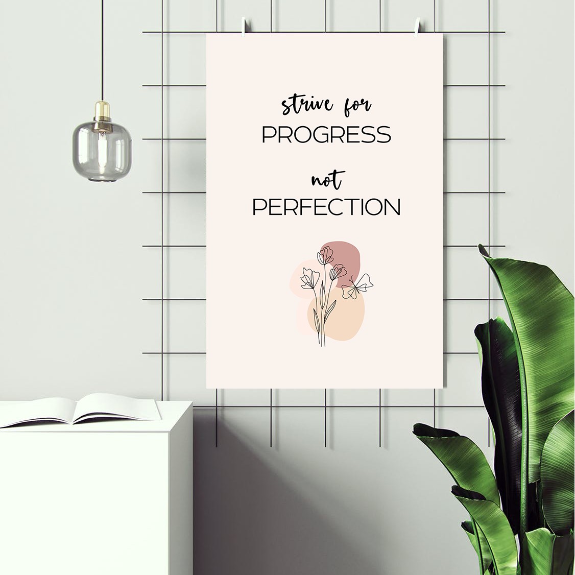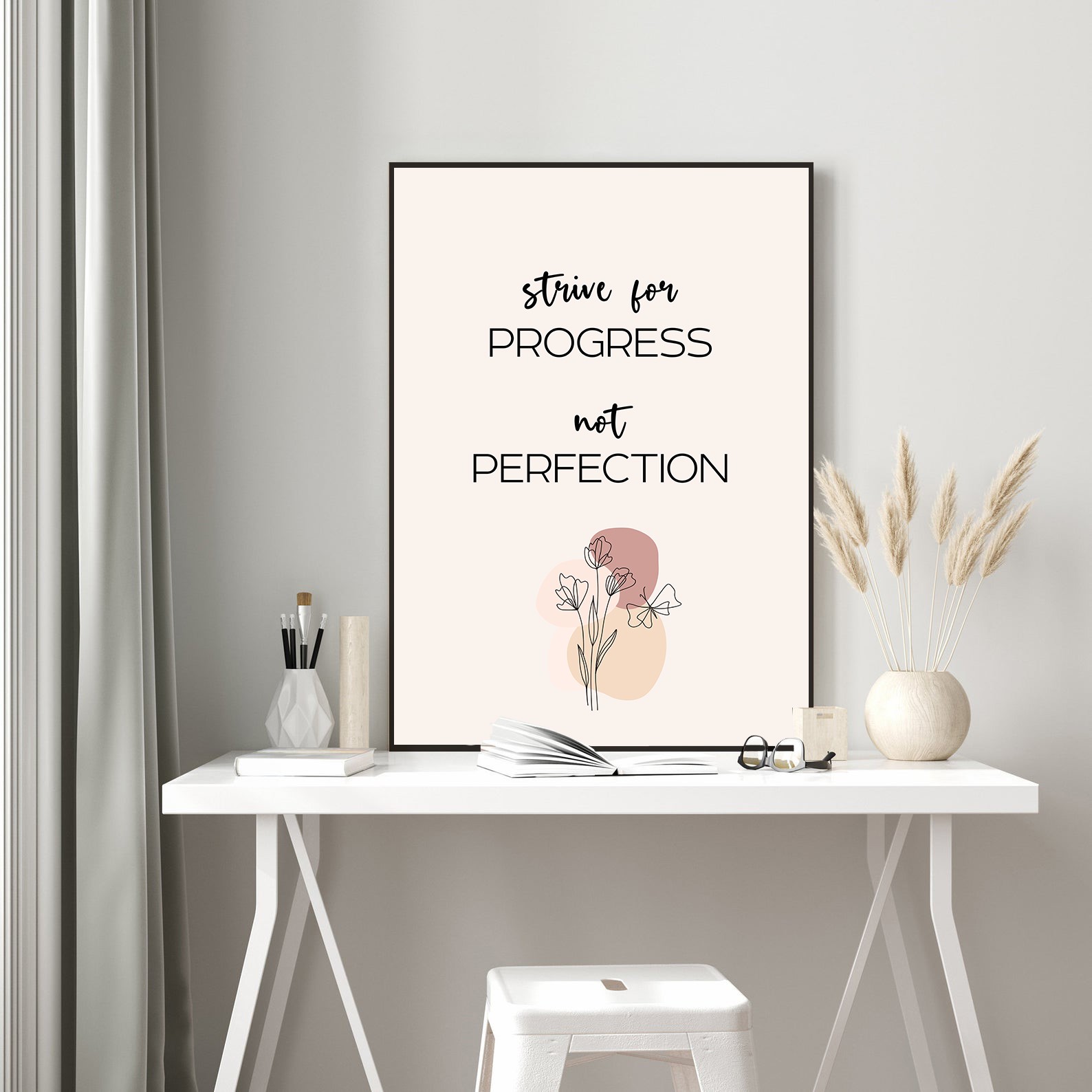 Embrace self-growth with this elegant motivational wall art. Featuring the empowering phrase “Strive for Progress, Not Perfection,” this piece serves as a daily reminder to focus on continuous improvement rather than unrealistic ideals. The soft beige background, delicate floral line art, and warm earthy tones create a calming aesthetic, perfect for any setting.