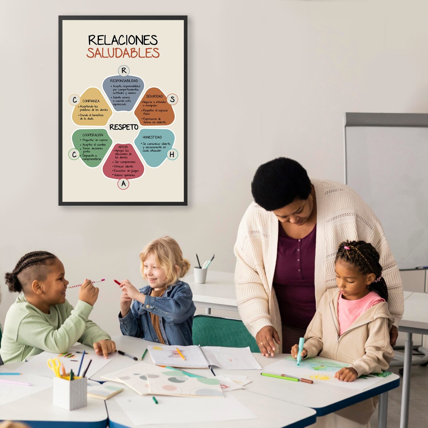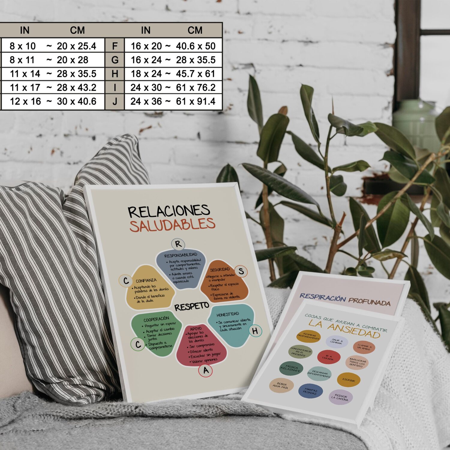 Promote positive communication, respect, and emotional well-being with this beautifully designed Spanish-language poster on healthy relationships. Perfect for classrooms, counseling offices, and therapy spaces, this educational tool highlights key relationship values such as trust, honesty, cooperation, and support.
