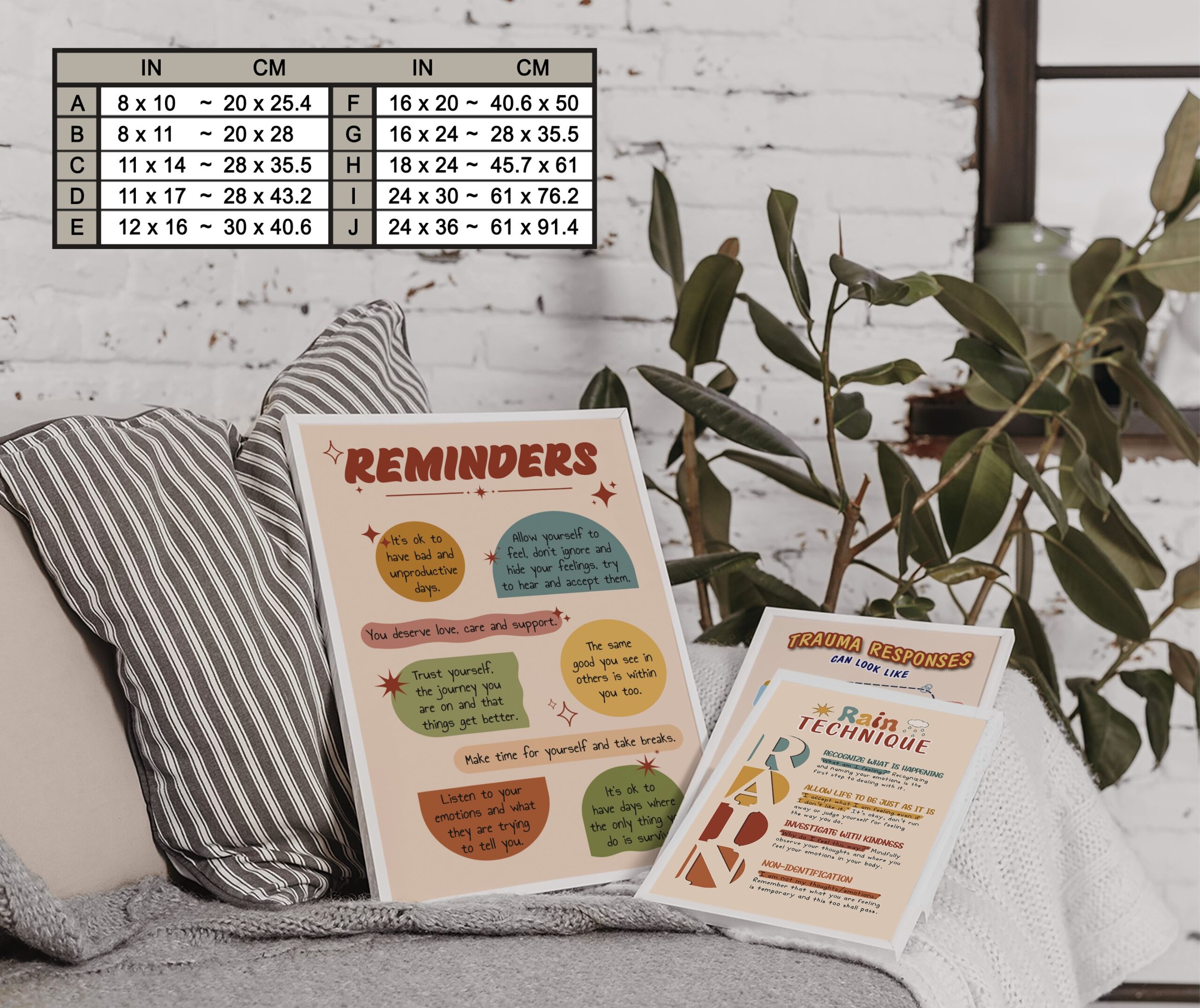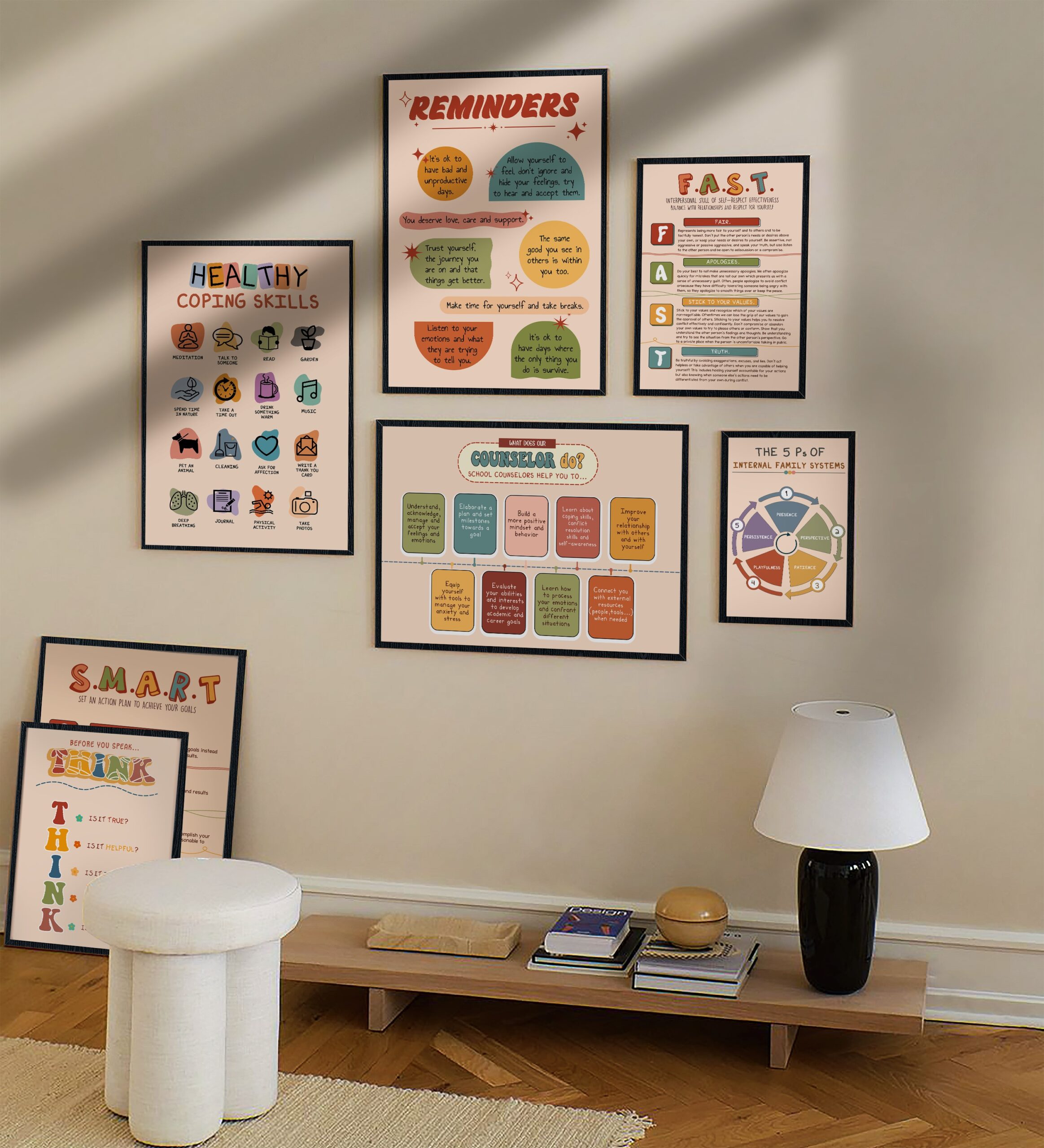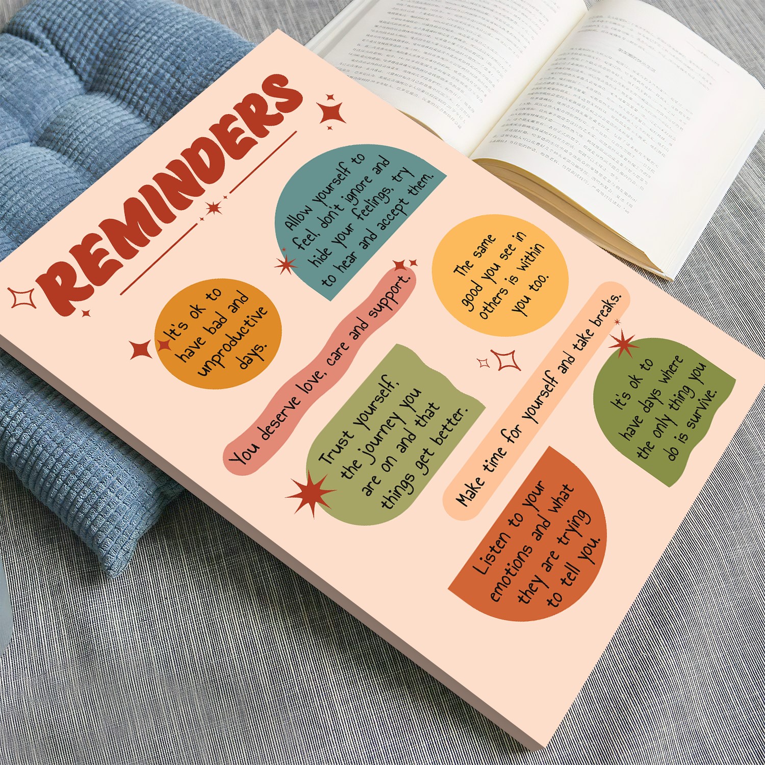Encourage self-compassion and emotional well-being with this beautifully designed mental health reminders poster. Featuring soothing boho-inspired visuals and gentle affirmations, this calming corner essential helps individuals embrace self-care and self-acceptance. Perfect for therapy offices, classrooms, counseling spaces, and personal self-care areas, this inspiring decor piece fosters a supportive and uplifting environment.