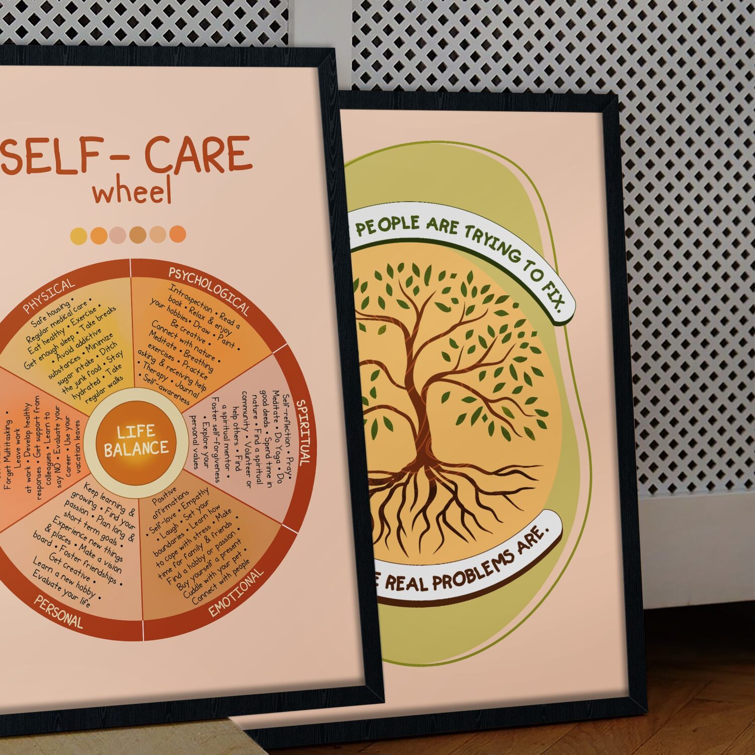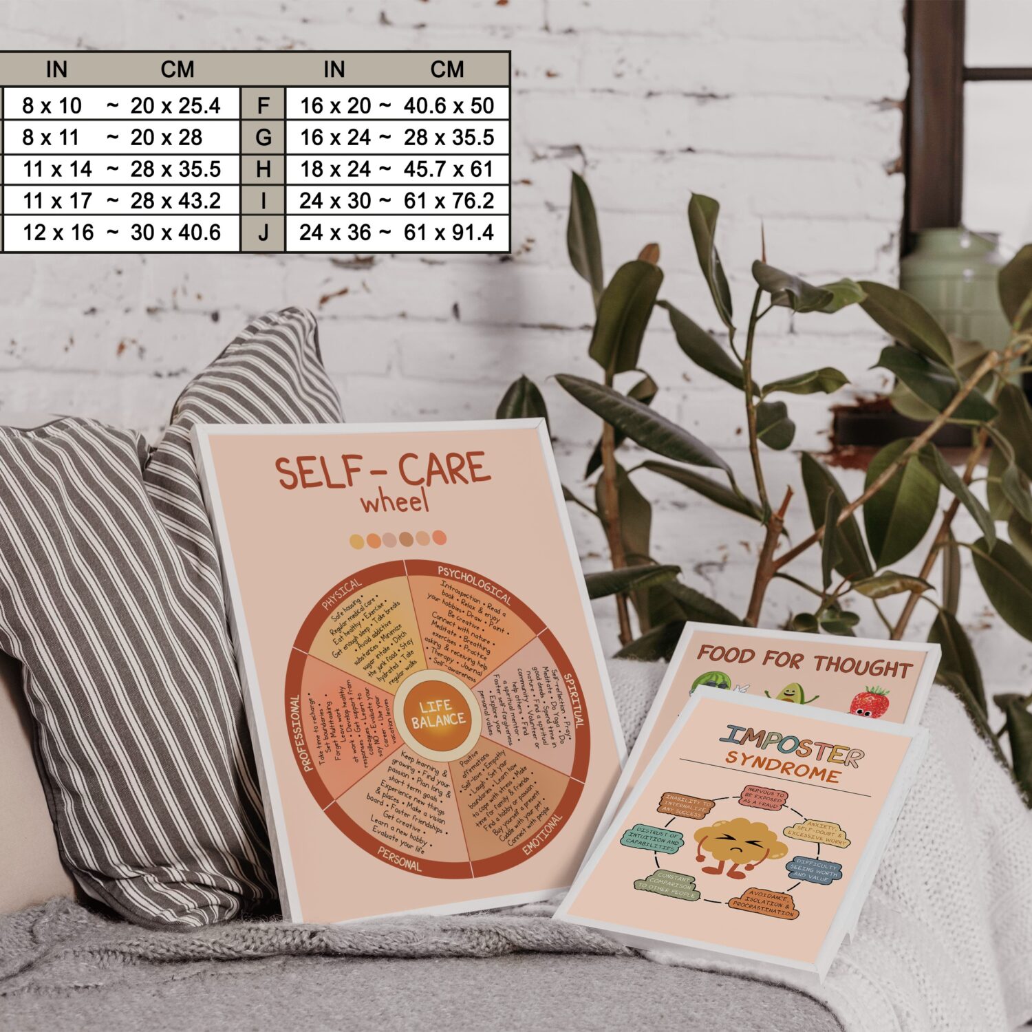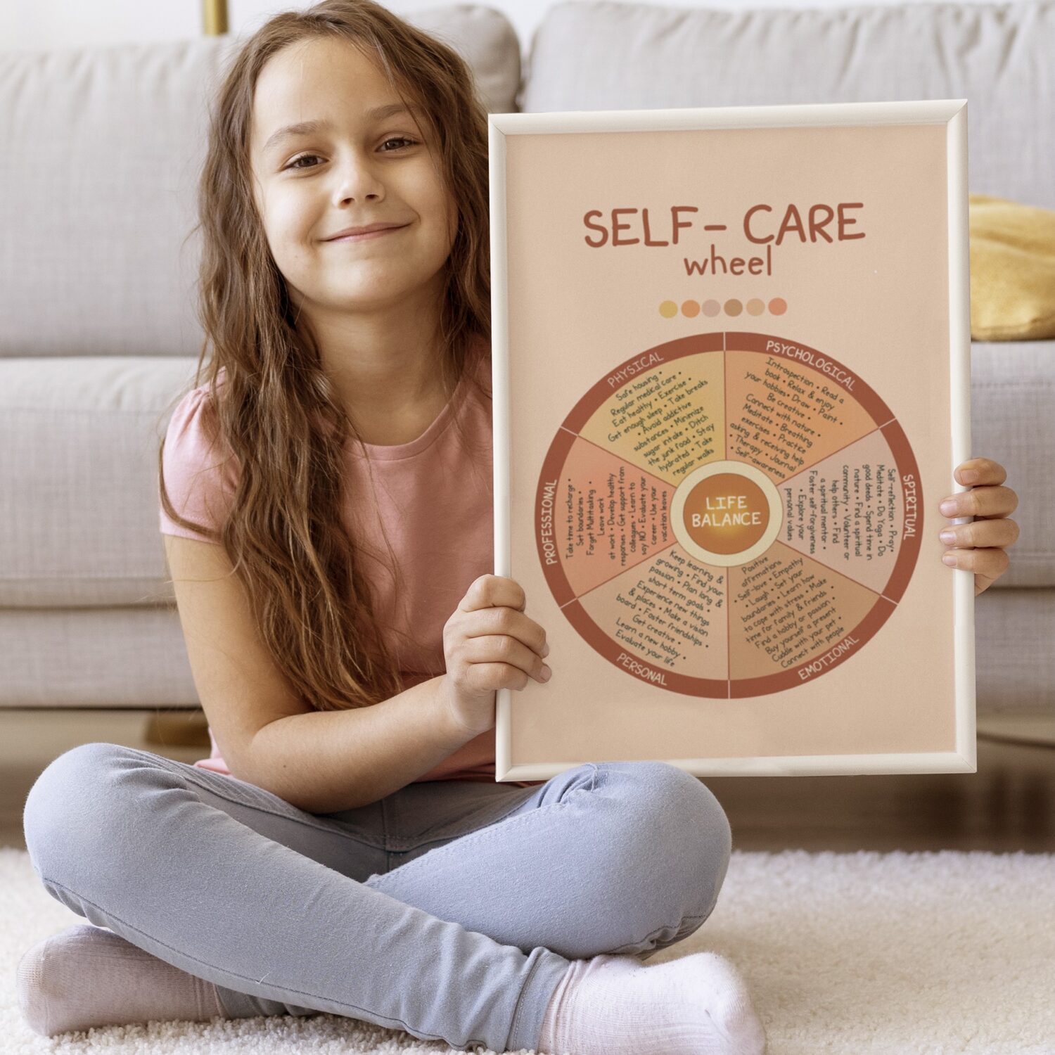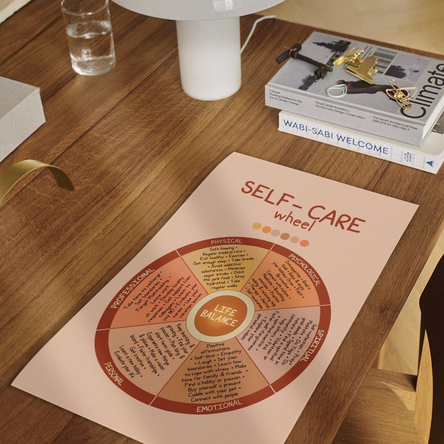 Prioritize your well-being with this beautifully designed Self-Care Wheel, an essential tool for fostering mental health and emotional resilience. This visual guide highlights six key areas-physical, psychological, emotional, spiritual, personal, and professional-helping individuals create a well-rounded self-care routine.