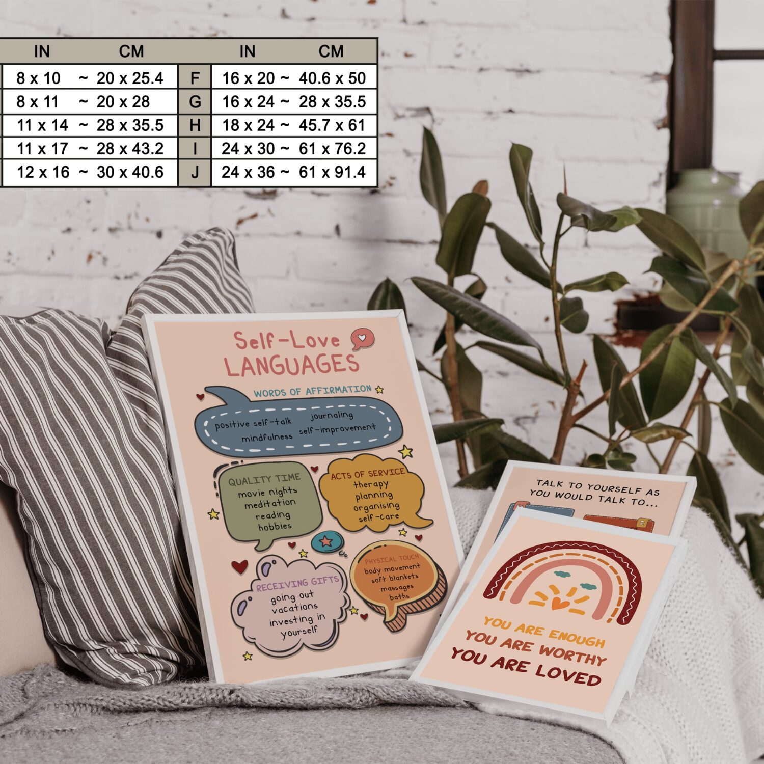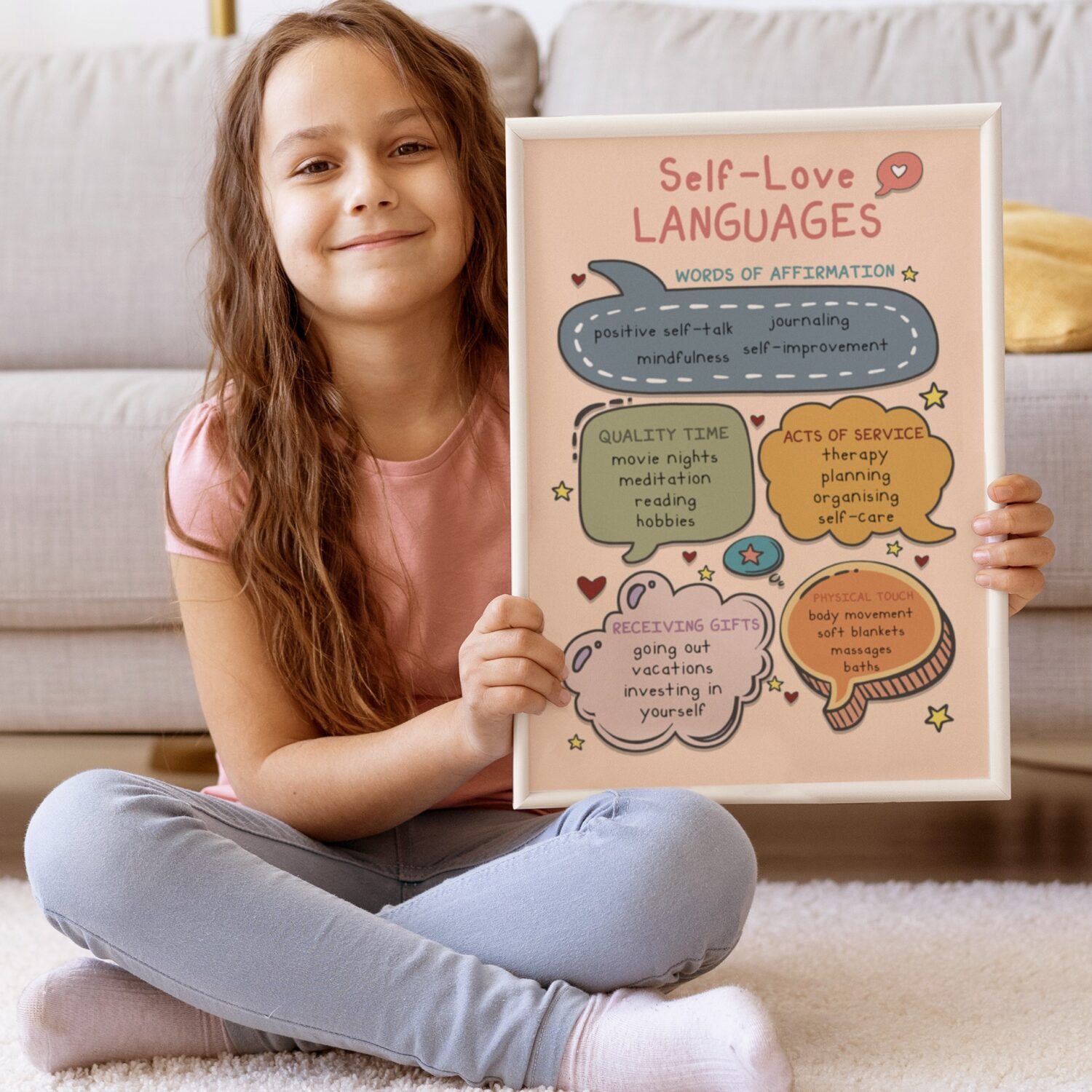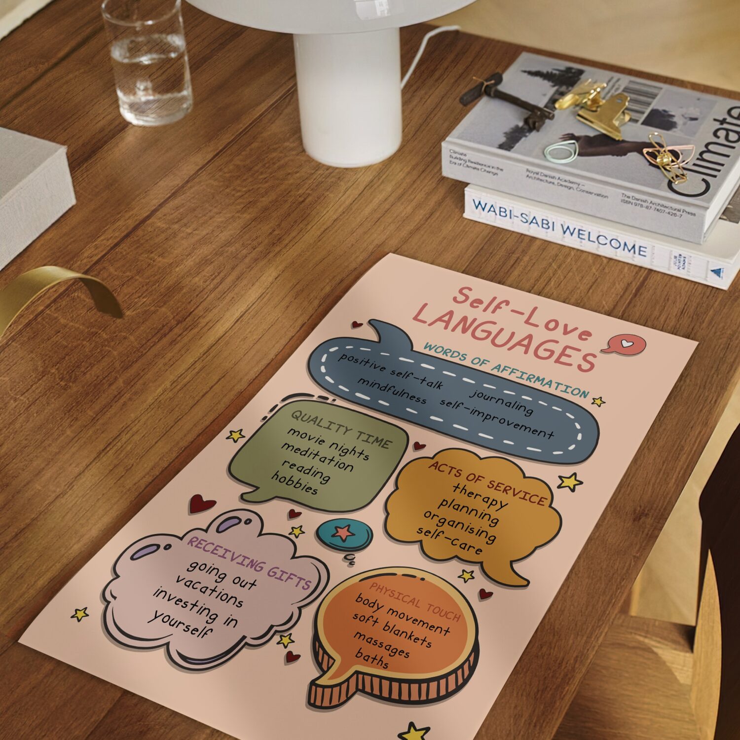 Understanding how you show love to yourself is essential for personal growth and emotional well-being. This beautifully designed “Self-Love Languages” poster is a perfect tool for self-affirmation, mindfulness, and self-care. Whether it’s through words of affirmation, quality time, acts of service, receiving gifts, or physical touch, this resource encourages a deeper connection with yourself.