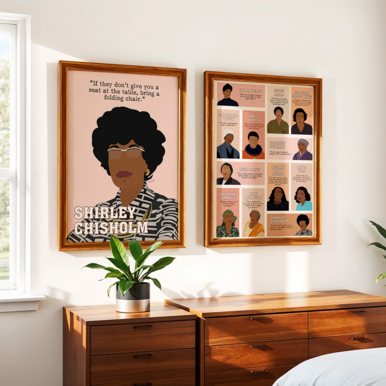 Honor the groundbreaking legacy of the first Black woman elected to the U.S. Congress and a fearless advocate for social justice and women’s rights. This thoughtfully designed poster features a minimalist portrait in her signature bold style, set against a soft pink background. Her powerful inspirational quote reminds us to create our own opportunities when none are given.