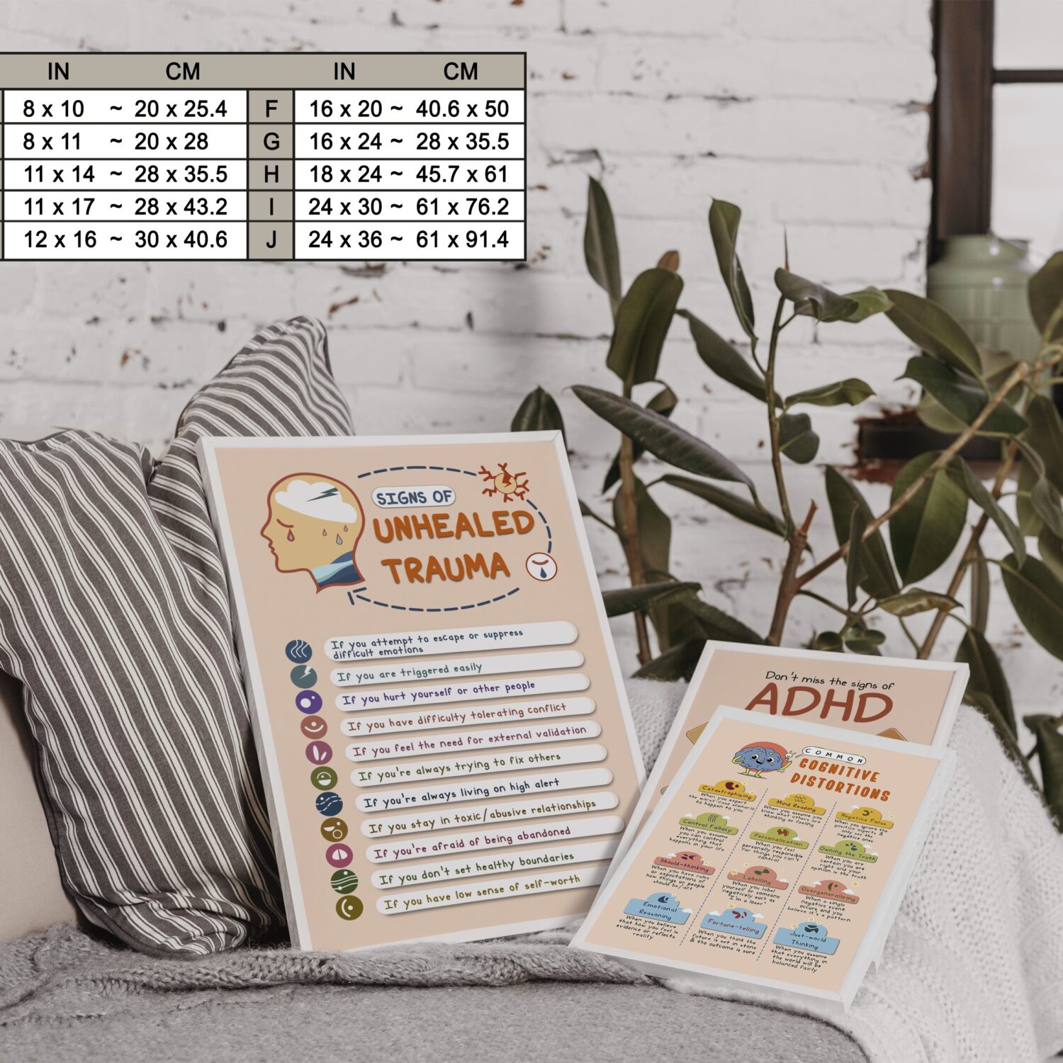 Raise awareness and encourage self-reflection with this informative Signs of Unhealed Trauma poster. Designed with a visually engaging layout, this resource highlights common indicators of unresolved trauma, including emotional suppression, difficulty setting boundaries, and fear of abandonment. A must-have for therapy offices, classrooms, and counseling spaces, it fosters conversation and promotes healing.