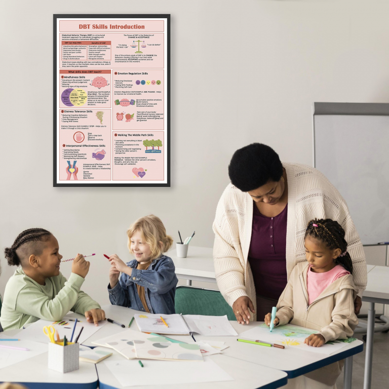 Skills Introduction DBT mental health art print can serve as a fantastic visual. Ideal for therapists, counselors, psychologists, teachers, and parents.