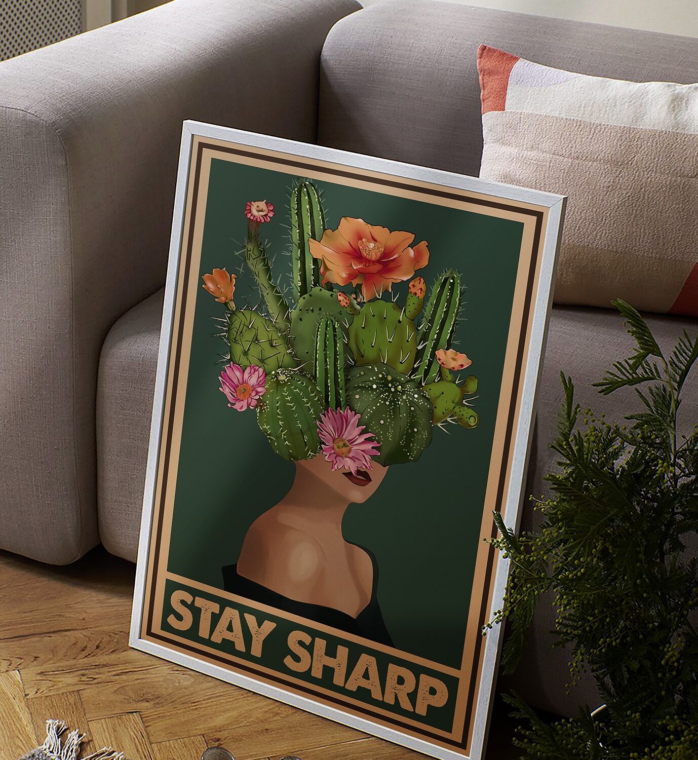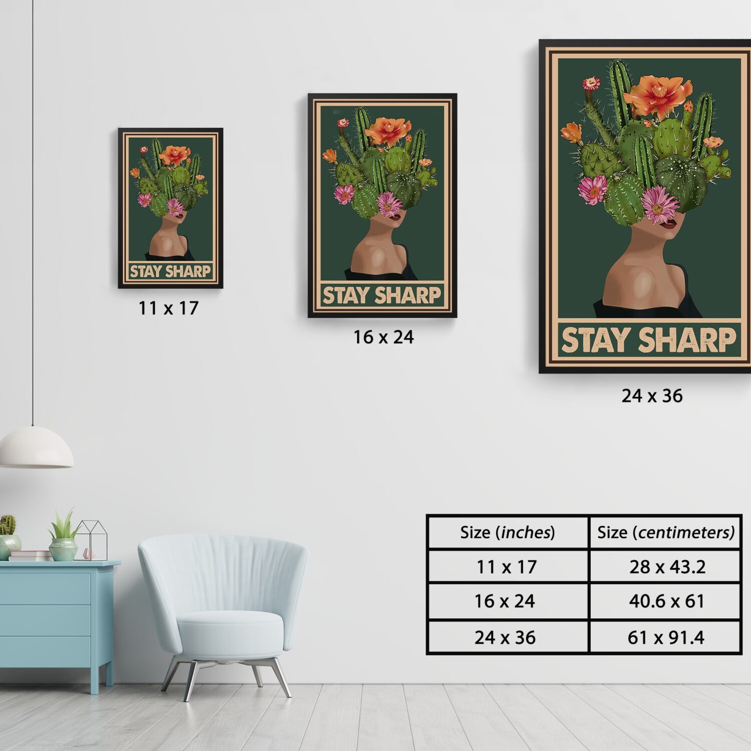 Embrace resilience and inner strength with this Stay Sharp Printable, a striking piece that embodies the power of perseverance and self-growth. The artwork features a poised figure with a crown of lush green cacti and delicate blossoms, symbolizing both toughness and beauty. With its unique vintage art aesthetic and rich, earthy tones, this piece blends artistic elegance with a profound message of mental health awareness and self-care.
