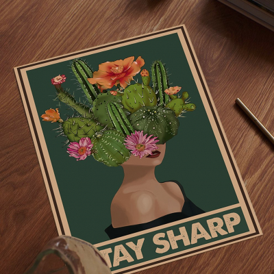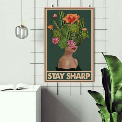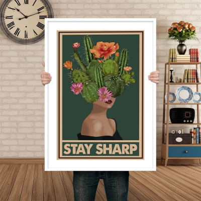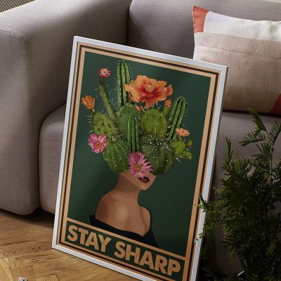 Embrace resilience and inner strength with this Stay Sharp Wall Art, a striking piece that embodies the power of perseverance and self-growth. The artwork features a poised figure with a crown of lush green cacti and delicate blossoms, symbolizing both toughness and beauty. With its unique vintage art aesthetic and rich, earthy tones, this piece blends artistic elegance with a profound message of mental health awareness and self-care.