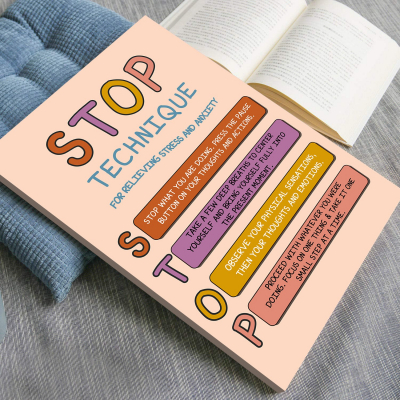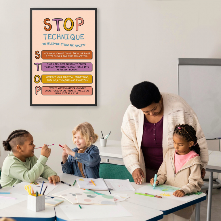 Stop Technique boho mental health art print can serve as a fantastic visual. Ideal for therapists, counselors, psychologists, teachers, and parents.