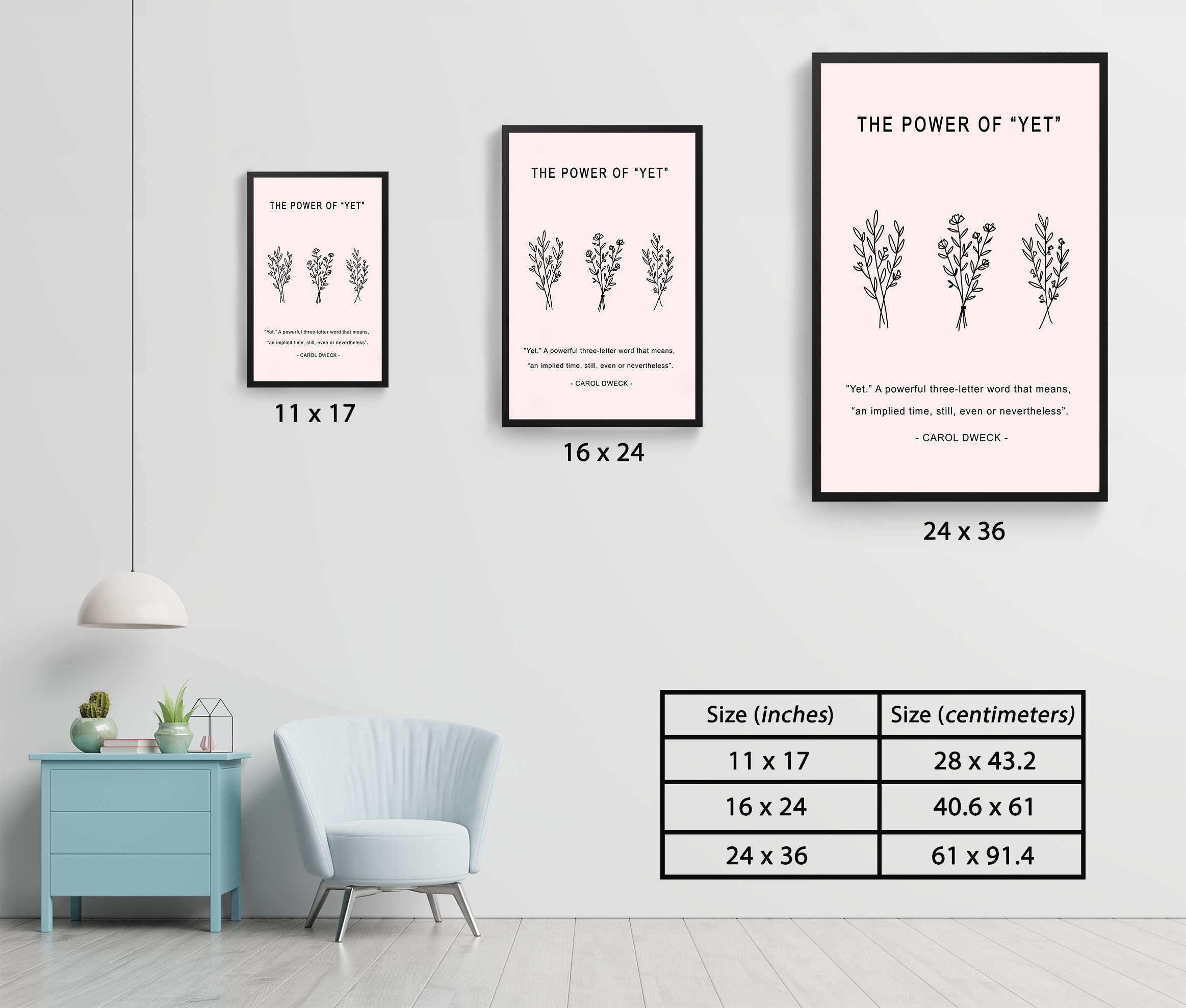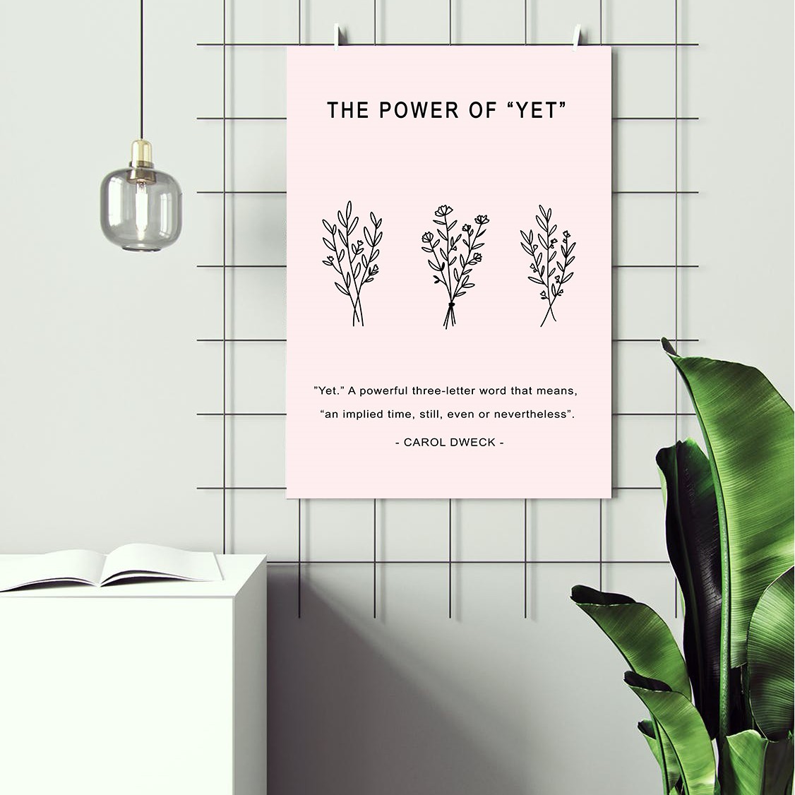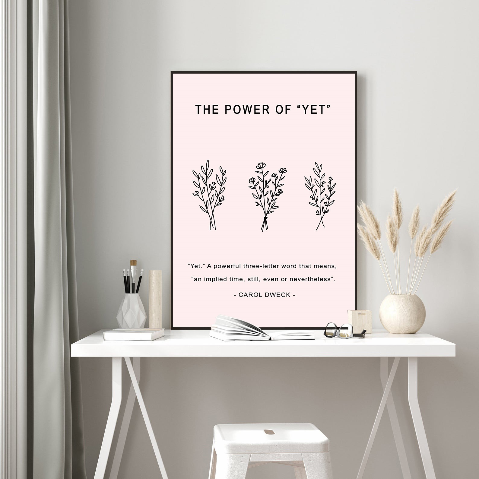 Embrace resilience and continuous growth with this beautifully designed Power of Yet poster. Featuring Carol Dweck’s transformative concept, this motivational wall art serves as a daily reminder that success is a journey, not a destination. The delicate botanical illustrations paired with soft beige tones create a calming aesthetic, perfect for any space.