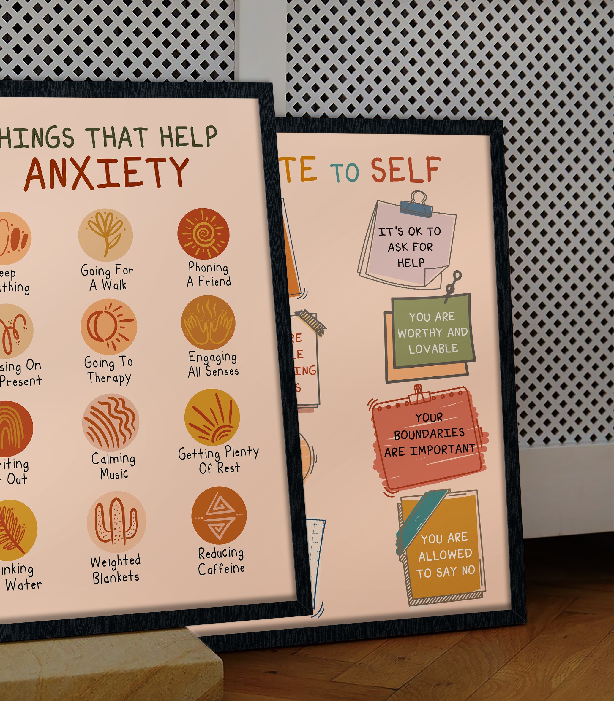 Managing anxiety can feel overwhelming, but small, mindful practices can make a world of difference. This beautifully designed Things That Help Anxiety poster serves as a calming and supportive guide, listing simple yet effective self-care strategies like deep breathing, going for a walk, writing out thoughts, and engaging the senses.