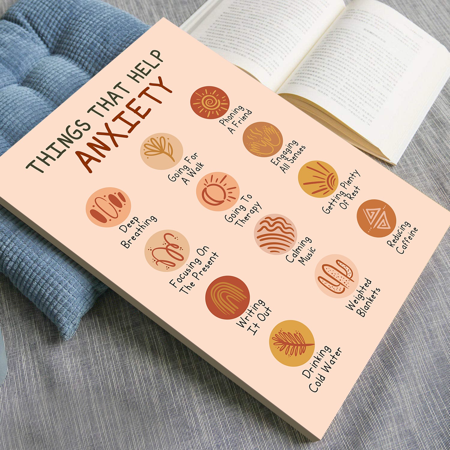 Let this Things That Help Anxiety poster be a source of comfort and encouragement. Add it to your space and promote mindfulness and well-being.