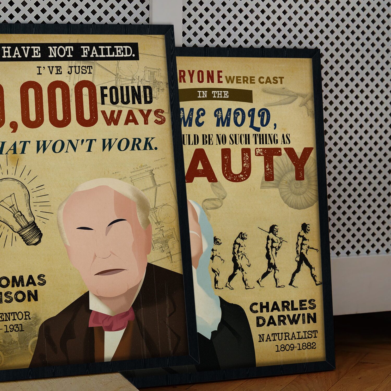Celebrate the power of persistence with this striking wall art. Featuring a timeless quote about resilience in the face of failure, this piece is perfect for anyone who values determination and creative problem-solving. The artwork’s vintage-style design, warm sepia tones, and bold typography make it a captivating addition to any science decor setting.