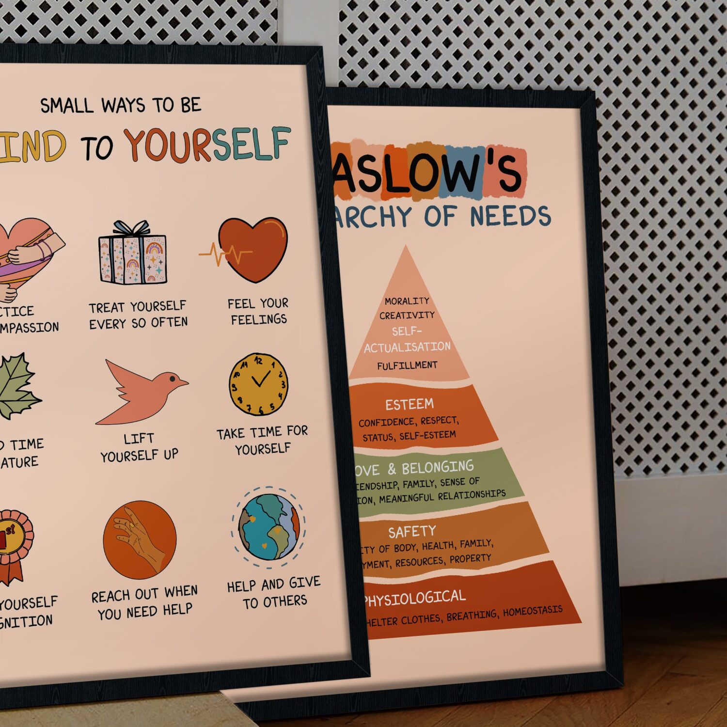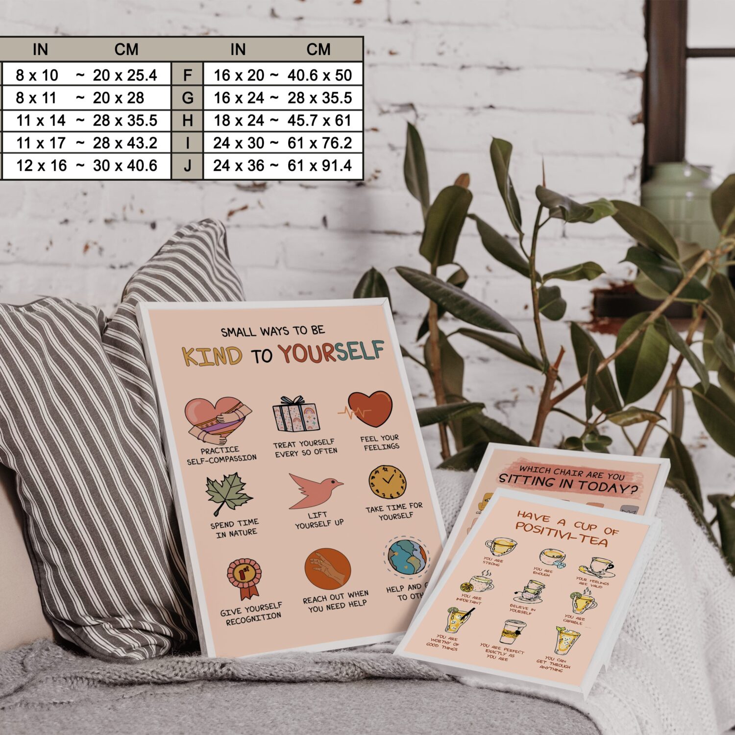 Encourage self-love and emotional well-being with this beautifully designed “Kind to Yourself” poster. Featuring simple yet powerful ways to practice self-care, positivity, and self-compassion, this printable is a perfect addition to therapy offices, classrooms, and calm corners.