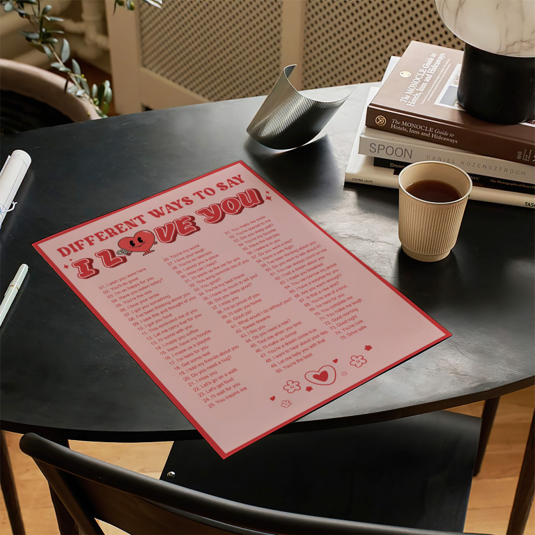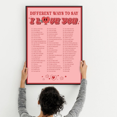 Express love in more ways than one with this adorable Ways to Say I Love You poster! Featuring 75 heartfelt phrases, this charming piece serves as a daily reminder of how love can be shown in simple yet meaningful ways. Whether you’re decorating your bedroom, office, or gifting it to a loved one, this positive affirmations print radiates warmth and appreciation.