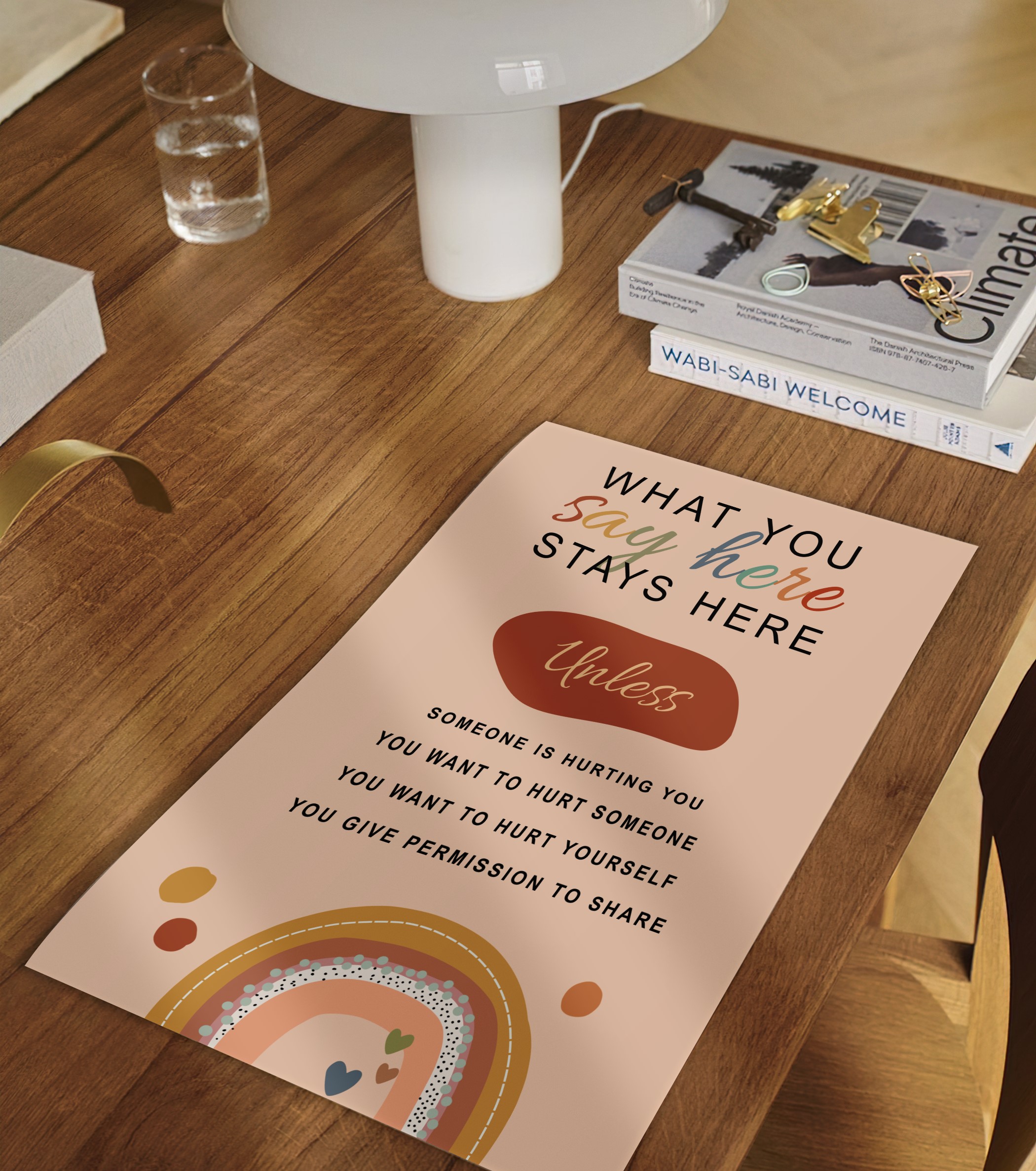 Create a space of trust, support, and emotional safety with this “What You Say in Here” mental health poster. Designed with a warm boho aesthetic and calming earth tones, this visual reminder sets clear boundaries while ensuring an open and accepting environment in therapy, counseling, or school settings.