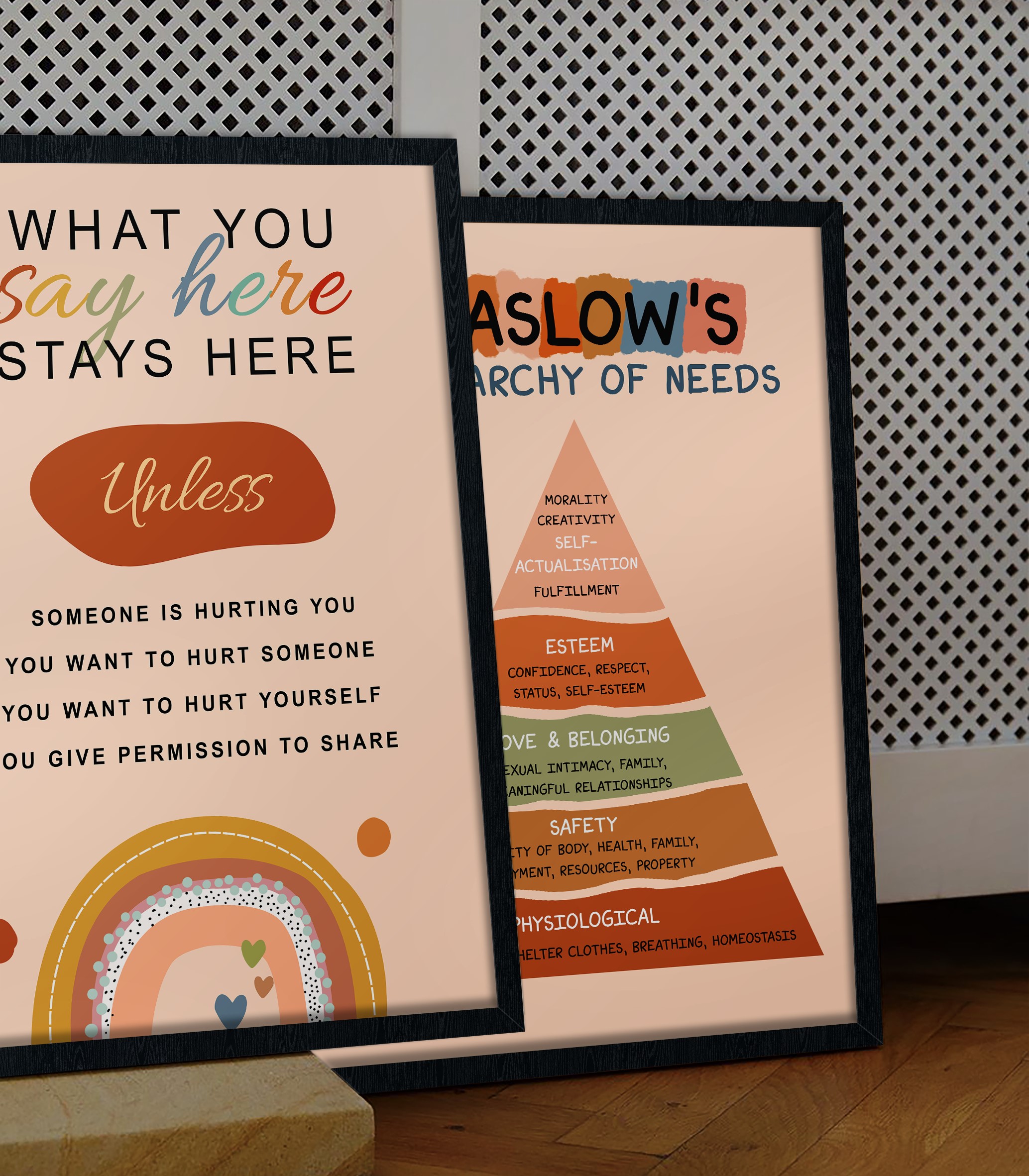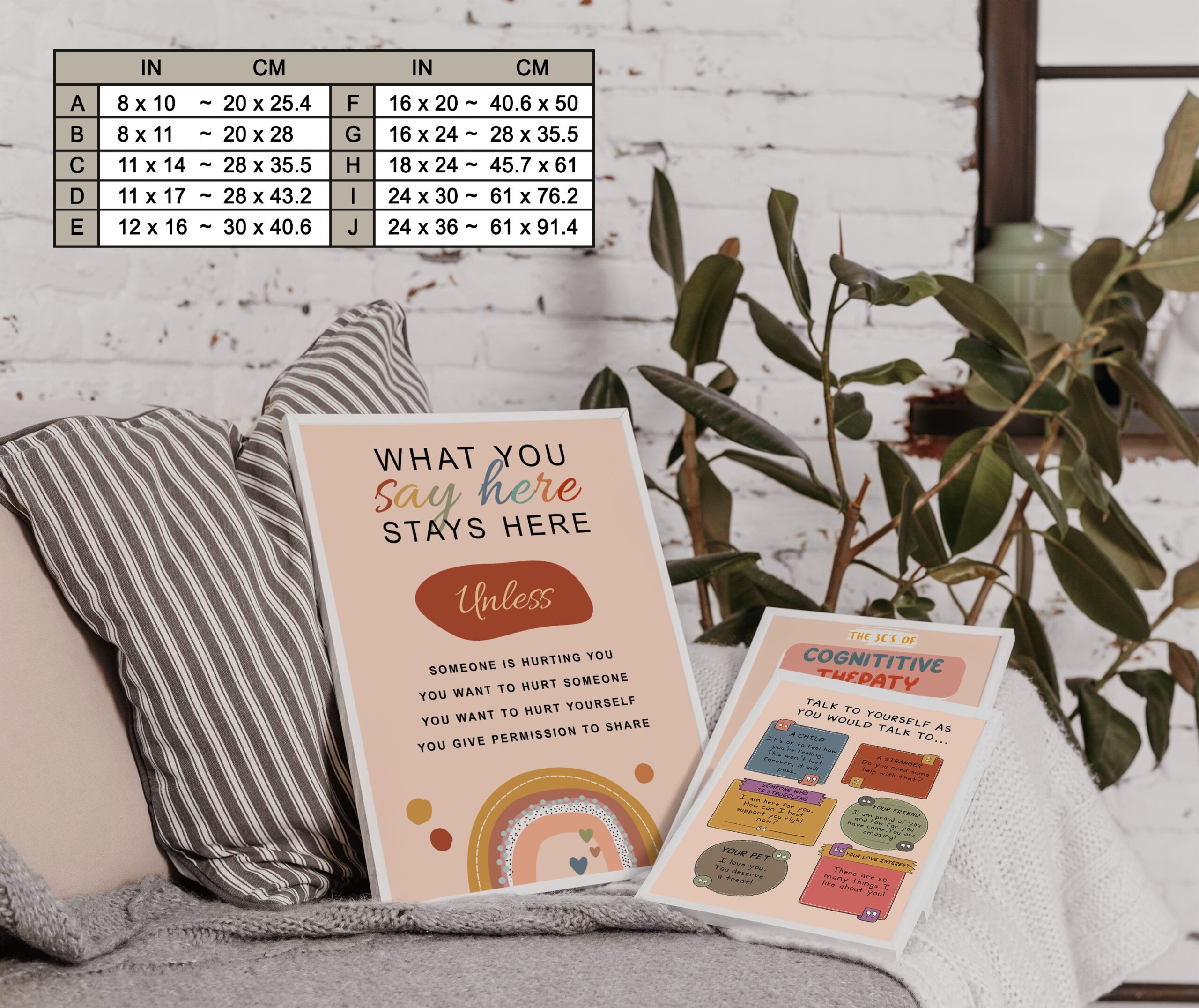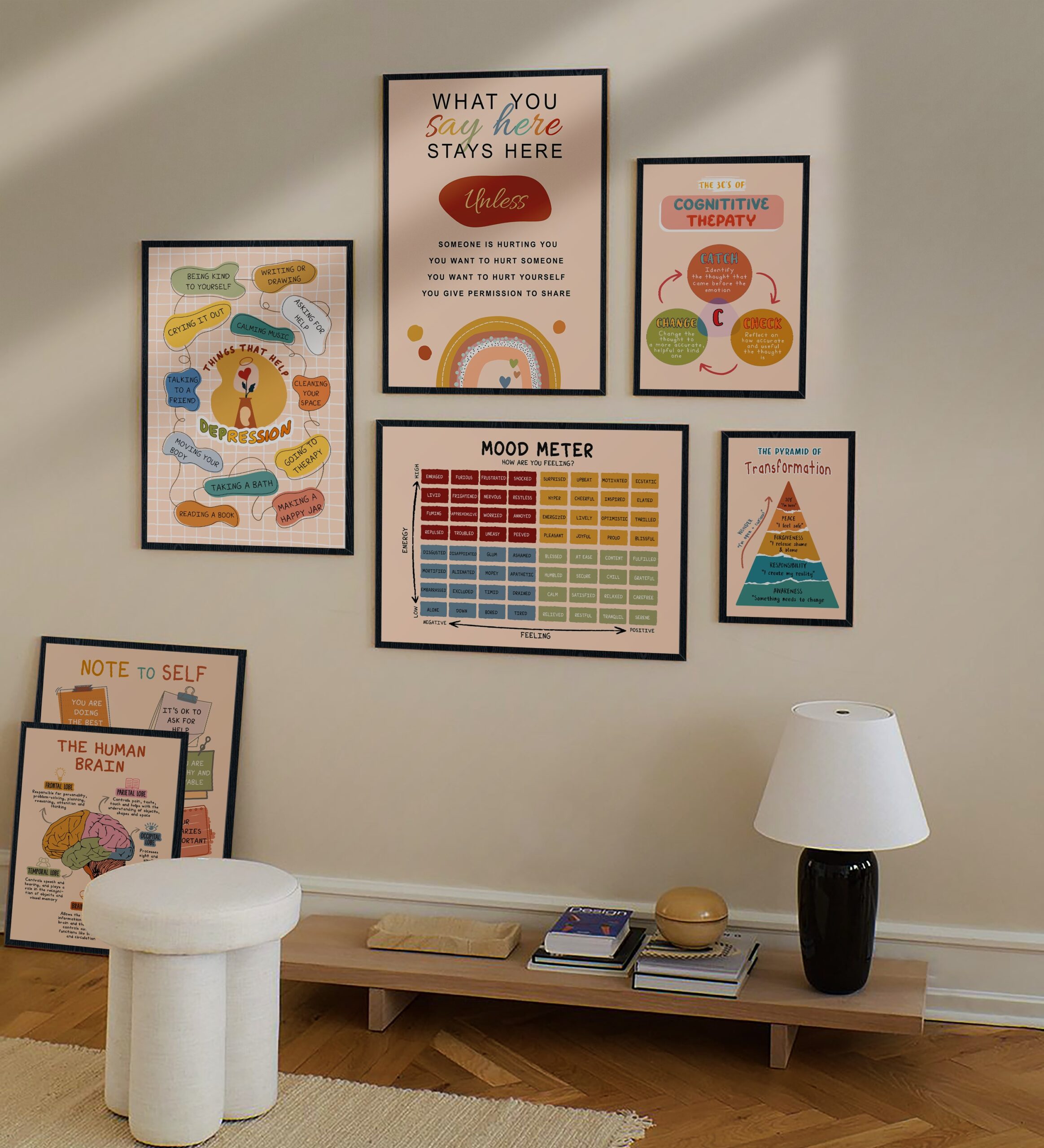- Soothing Boho Design – Soft, earthy hues paired with gentle typography create a welcoming atmosphere for calm corners, counseling rooms, and classrooms.