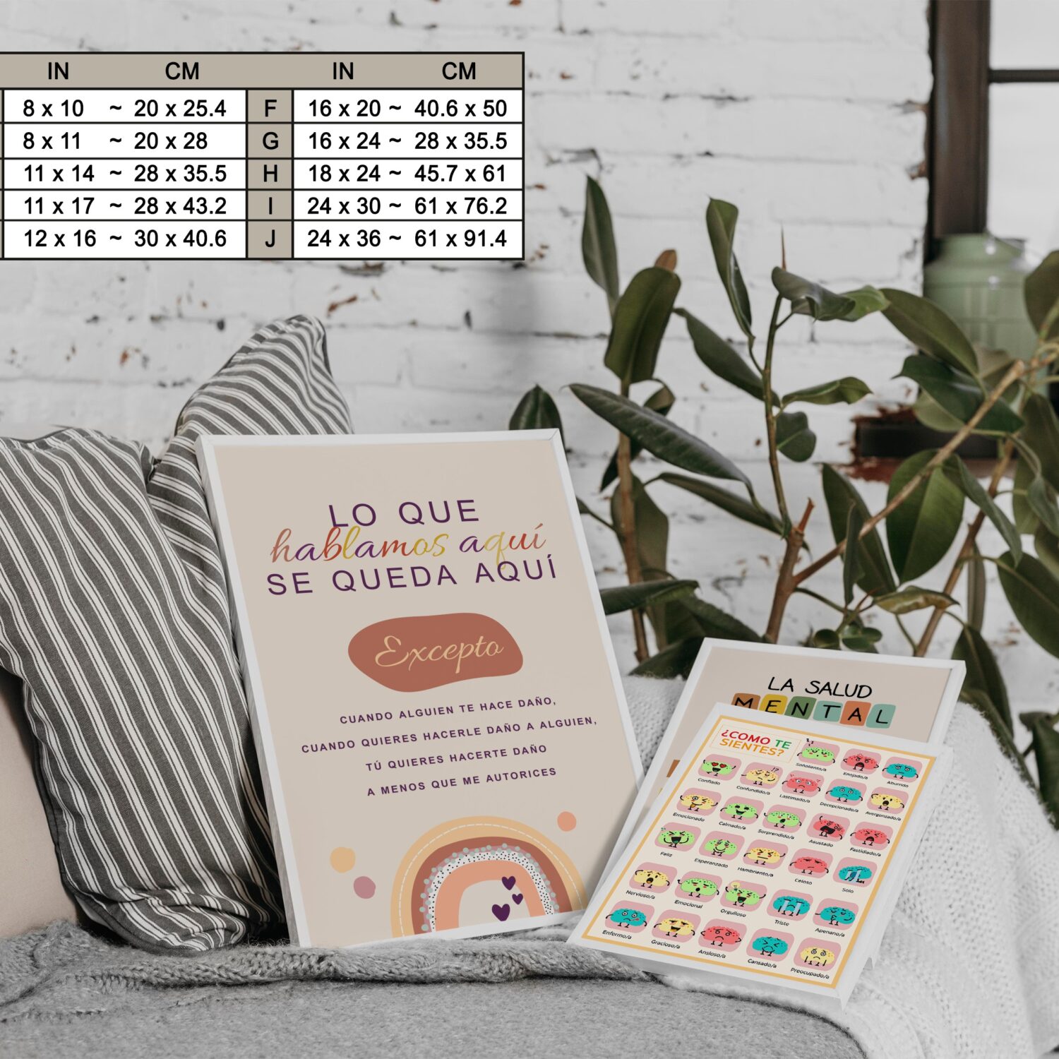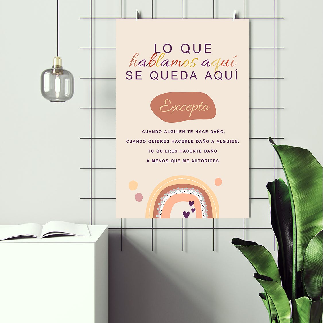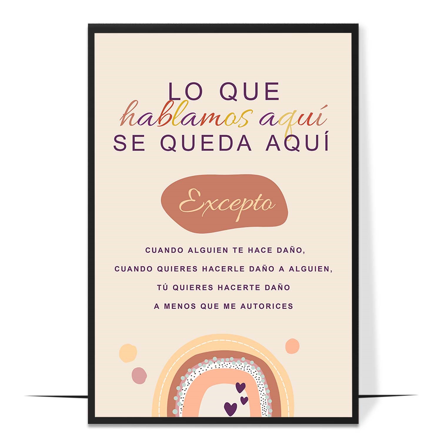 Create a safe and supportive environment with this beautifully designed Spanish mental health poster. Featuring the message “Lo Que Hablamos Aquí Se Queda Aquí – Excepto,” it reinforces trust while outlining essential exceptions for safety. Ideal for therapy offices, school counseling spaces, and calm corners, this visual reminder encourages open communication with clear boundaries.