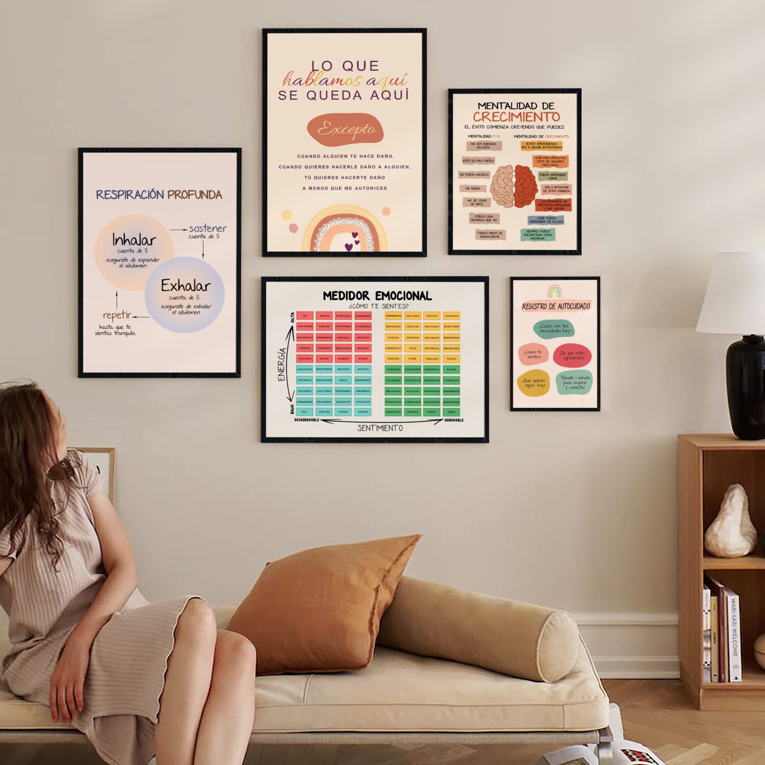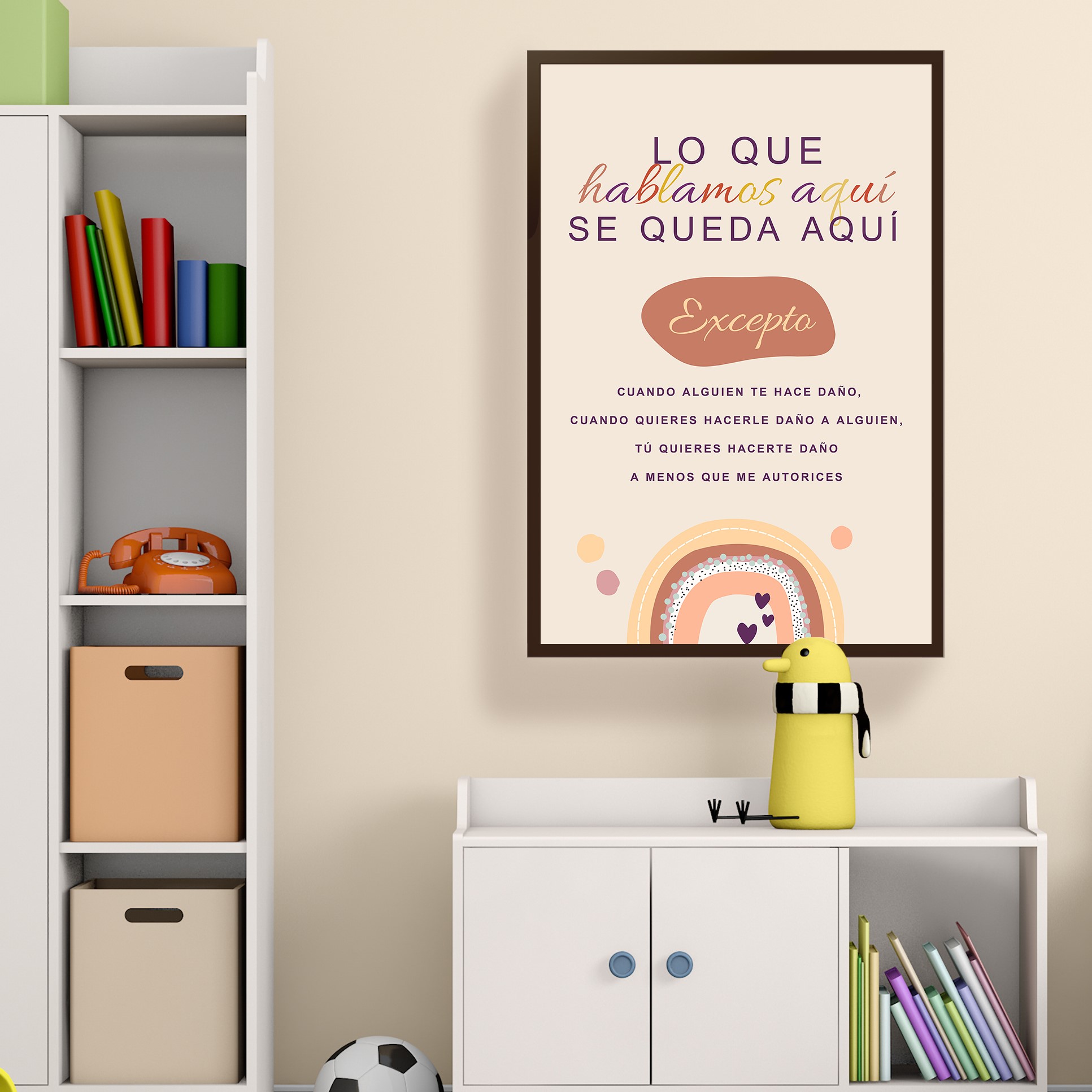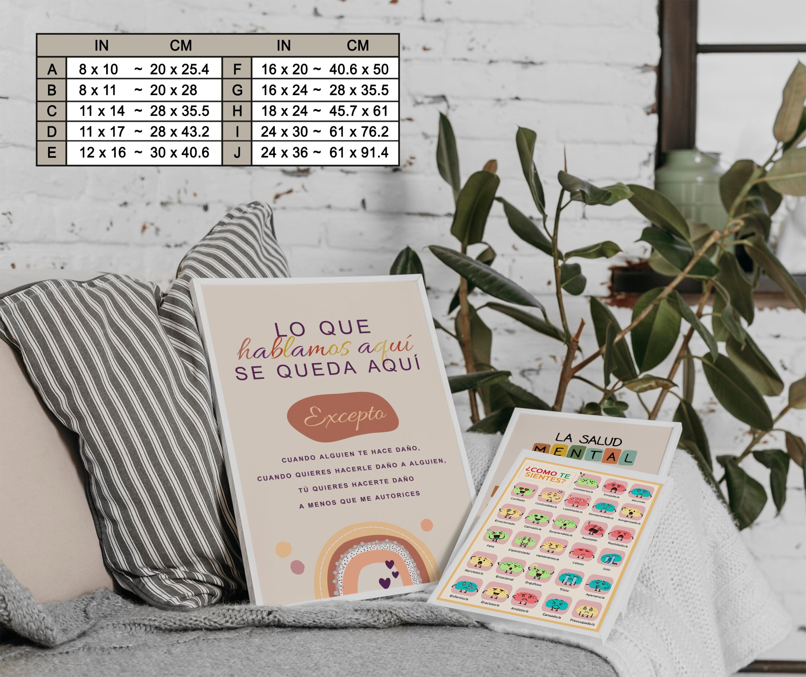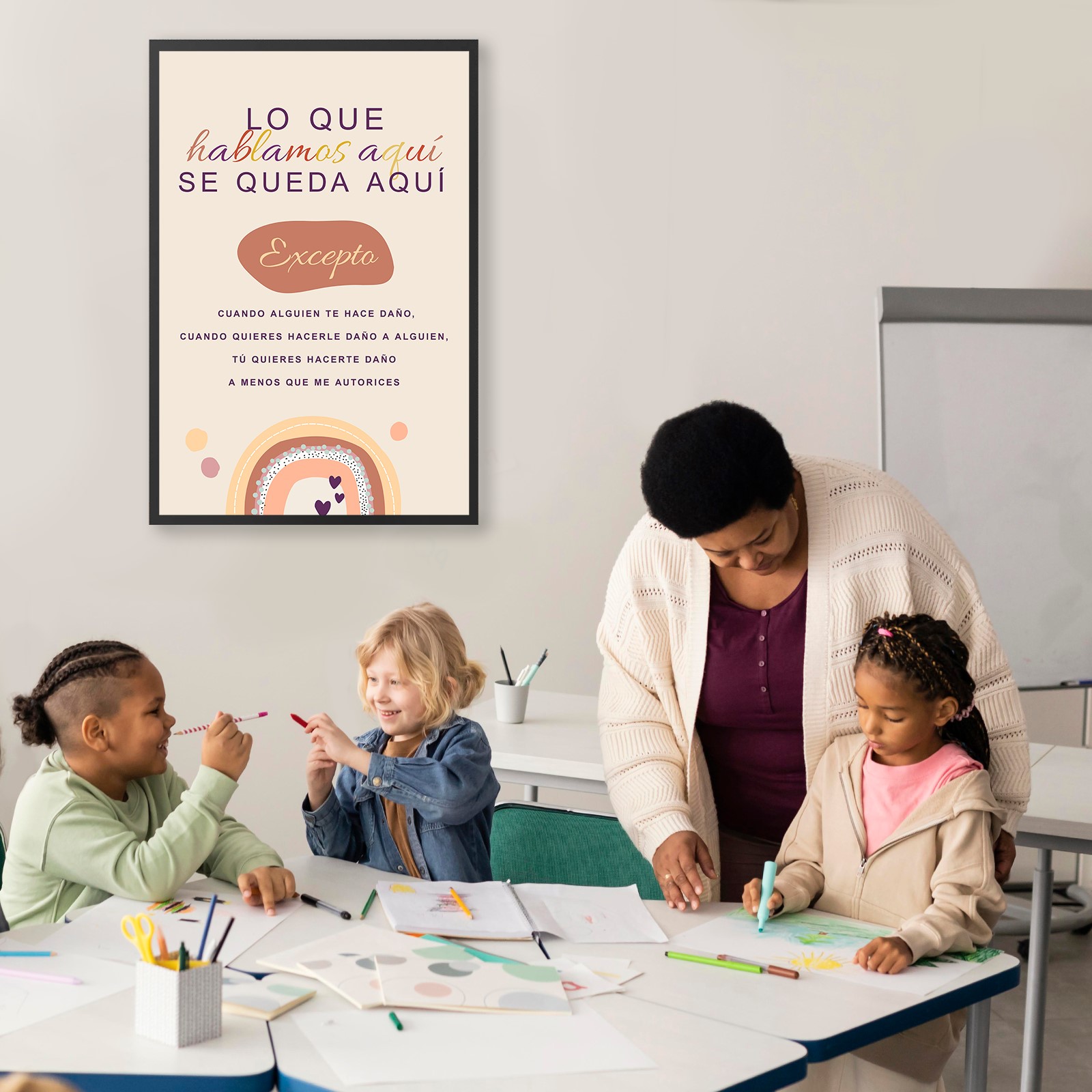 Create a safe and supportive environment with this beautifully designed Spanish mental health poster. Featuring the message “Lo Que Hablamos Aquí Se Queda Aquí – Excepto,” it reinforces trust while outlining essential exceptions for safety. Ideal for therapy offices, school counseling spaces, and calm corners, this visual reminder encourages open communication with clear boundaries.