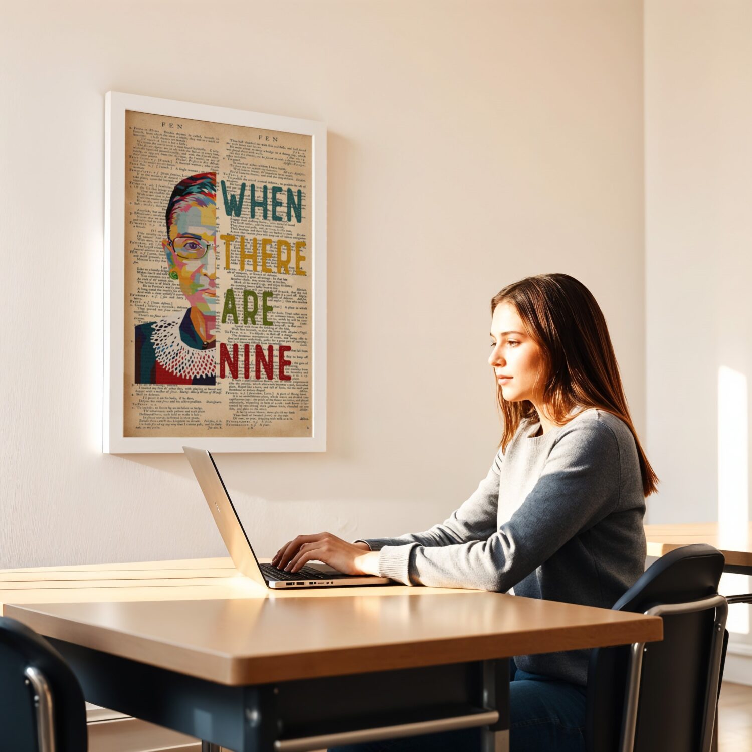 Celebrate justice, equality, and leadership with this stunning When There Are Nine wall art. This vibrant, mixed-media piece features a striking portrait overlayed on vintage book pages, exuding timeless strength and wisdom. The bold typography emphasizes an empowering message of representation, making it the perfect addition to any space that champions social justice and women in history.