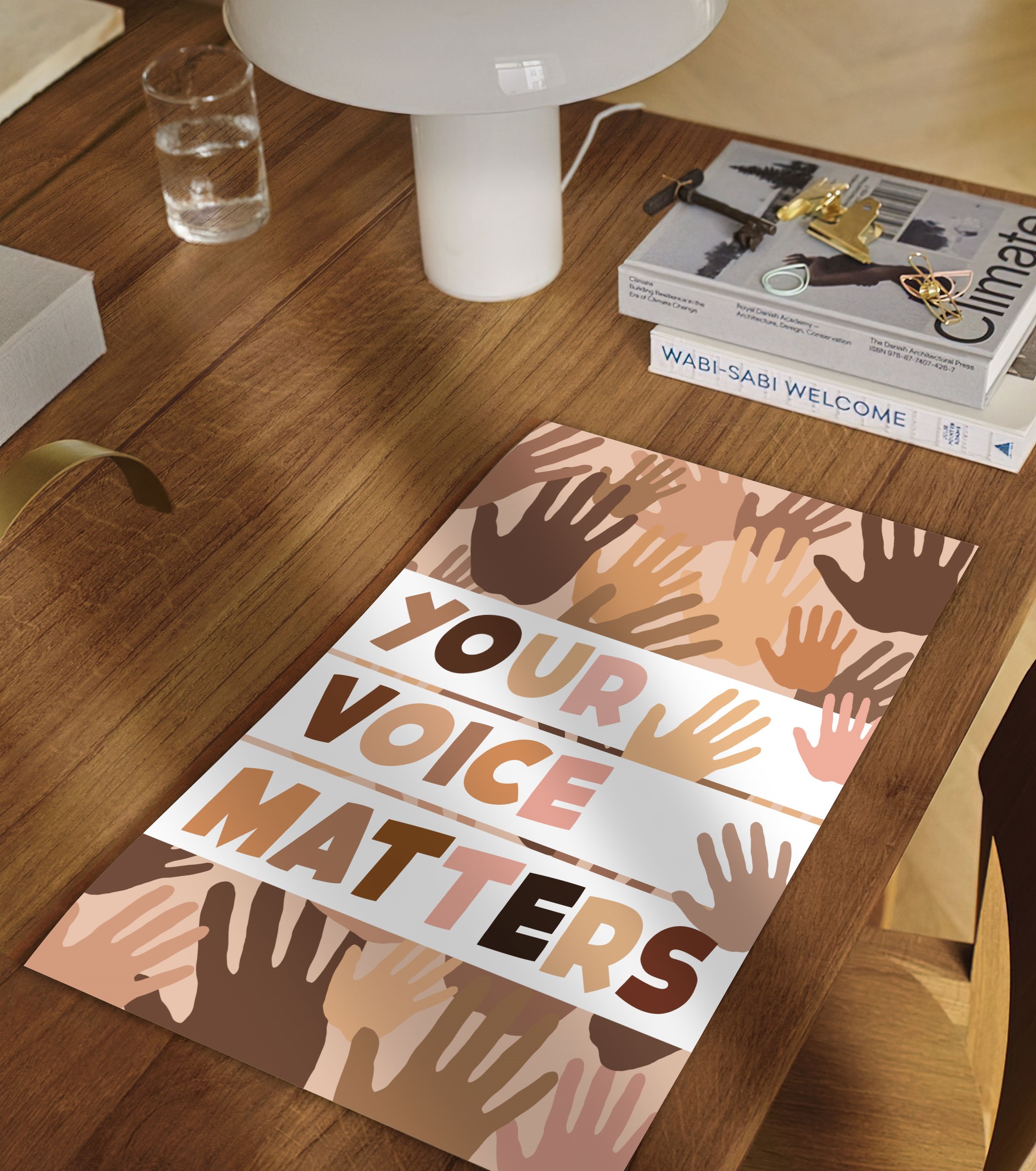 Amplify the message of empowerment and unity with this inspiring diversity poster. Featuring bold, warm-toned hands reaching upward, this artwork symbolizes multicultural representation, equity, and acceptance. The eye-catching text, “Your Voice Matters,” serves as a daily reminder that every individual has a voice worth hearing.